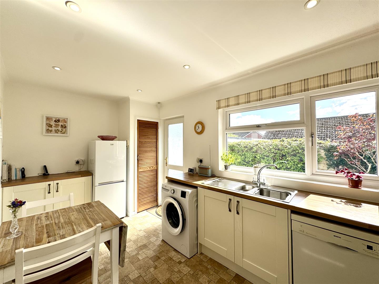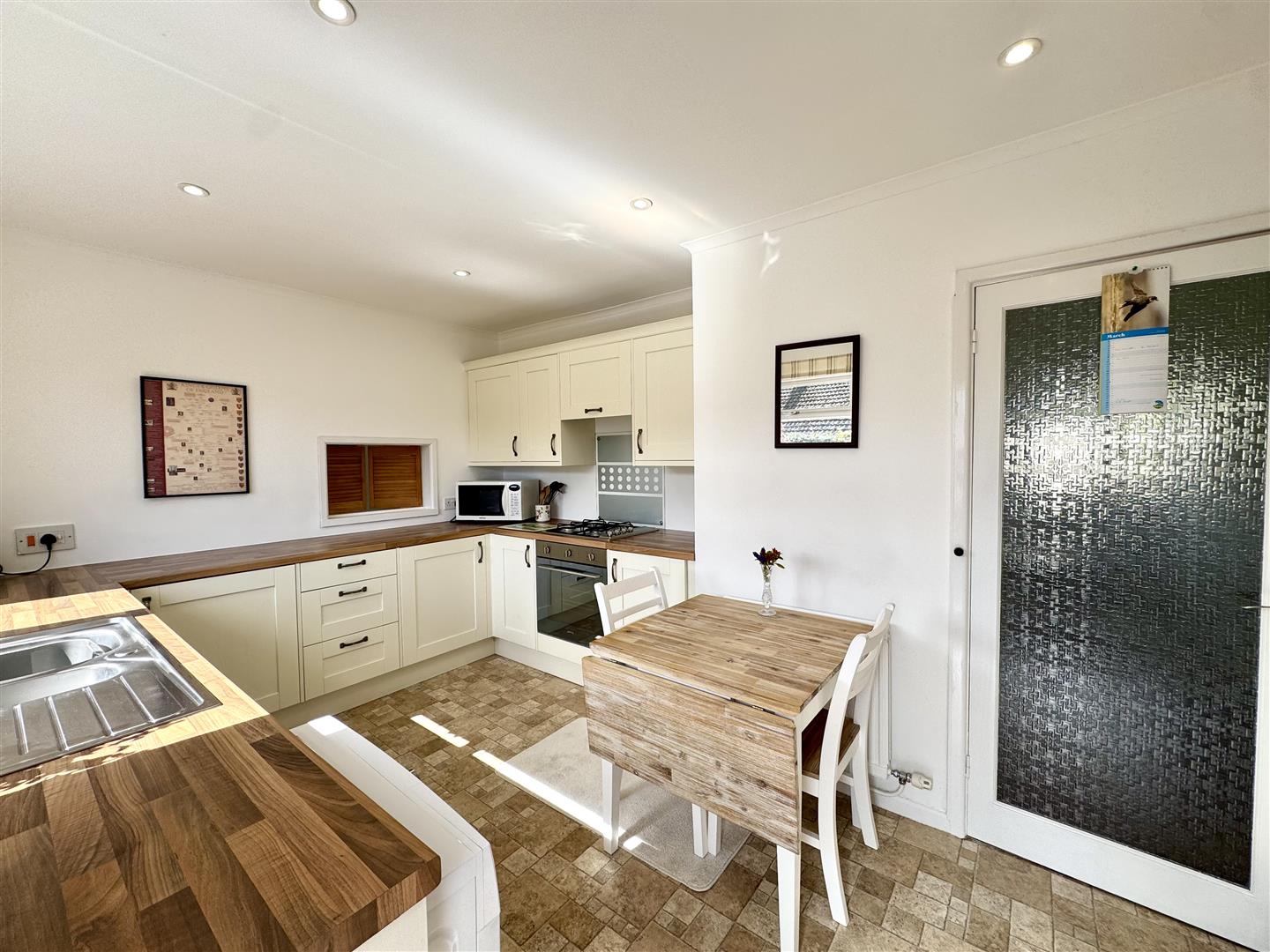 Appointed with a matching range of base and eye level storage units with ample wooden effect work surfacing over. One and a half bowl and drainer stainless steel sink unit with mixer tap. Four ring gas hob with concealed extractor over and SMEG oven beneath. Space for full height fridge/freezer, washing machine and dishwasher. Storage cupboard. Vinyl flooring. Panel radiator. Window and frosted door to side elevation.