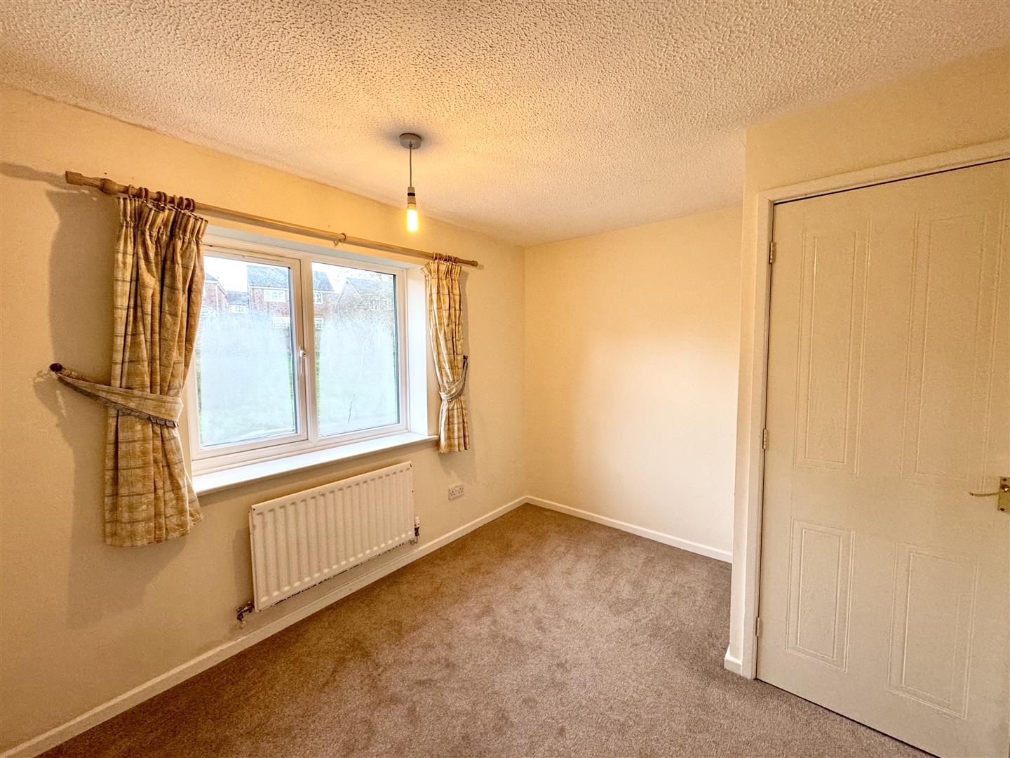 A double bedroom with window to front elevation. Built-in over stairs storage cupboard.