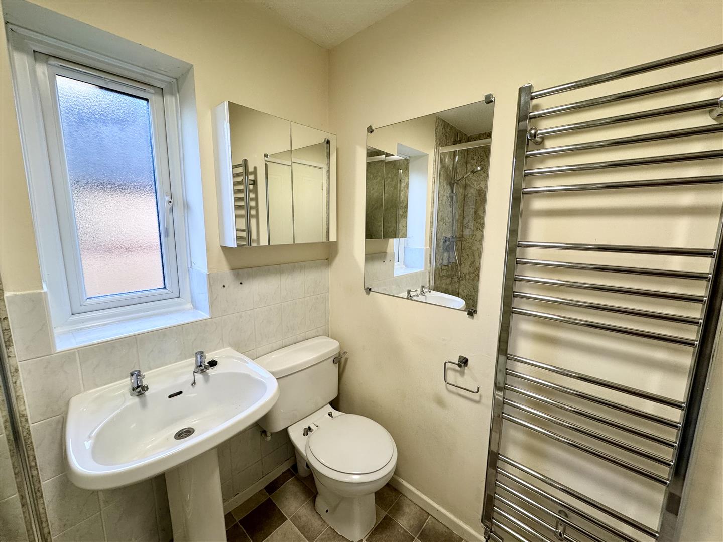 Comprising of a three-piece suite to include double shower unit with glass shower screen, chrome shower attachments and panelled walls, low-level WC and pedestal wash hand basin with chrome taps. Chrome heated towel rail. Tile effect flooring. Frosted window to side elevation.