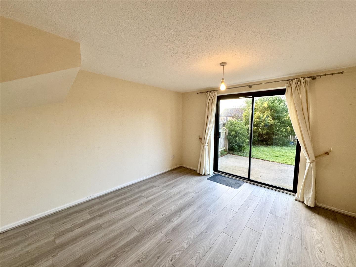 Spacious reception room with sliding doors leading out to the garden. Wooden effect flooring.