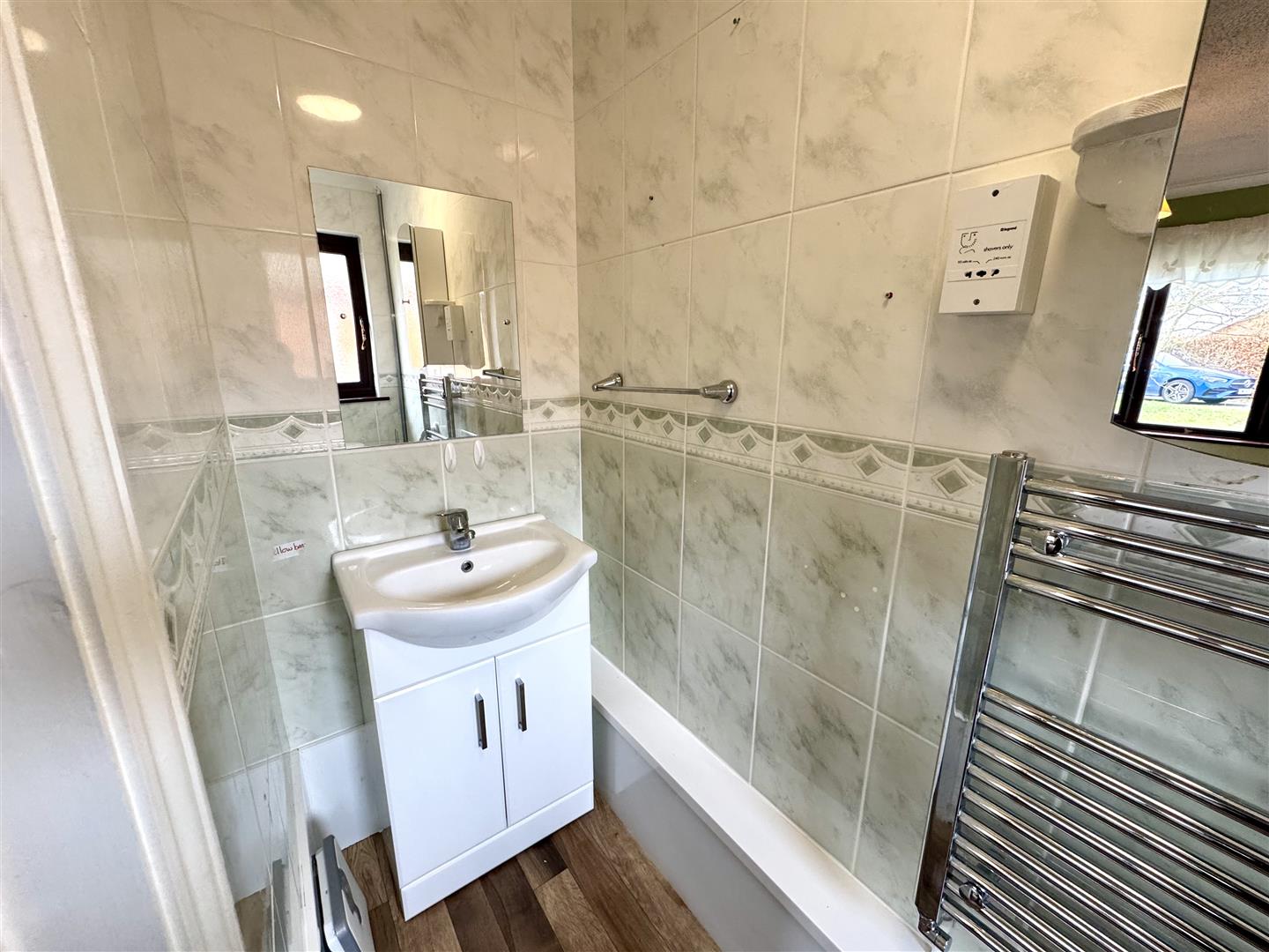 Recently updated and now comprising a modern neutral suite to include low-level WC, wash hand basin with mixer tap and tiled splashback inset to a vanity unit and double width walk-in shower cubicle with PVC surround and mains fed shower. Wood effect vinyl floor. Heated towel rail.