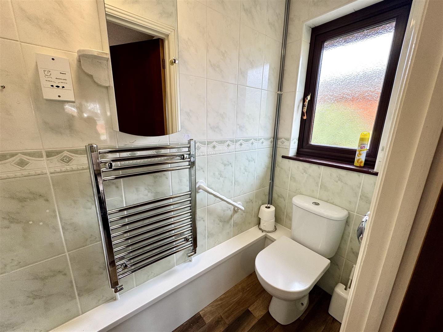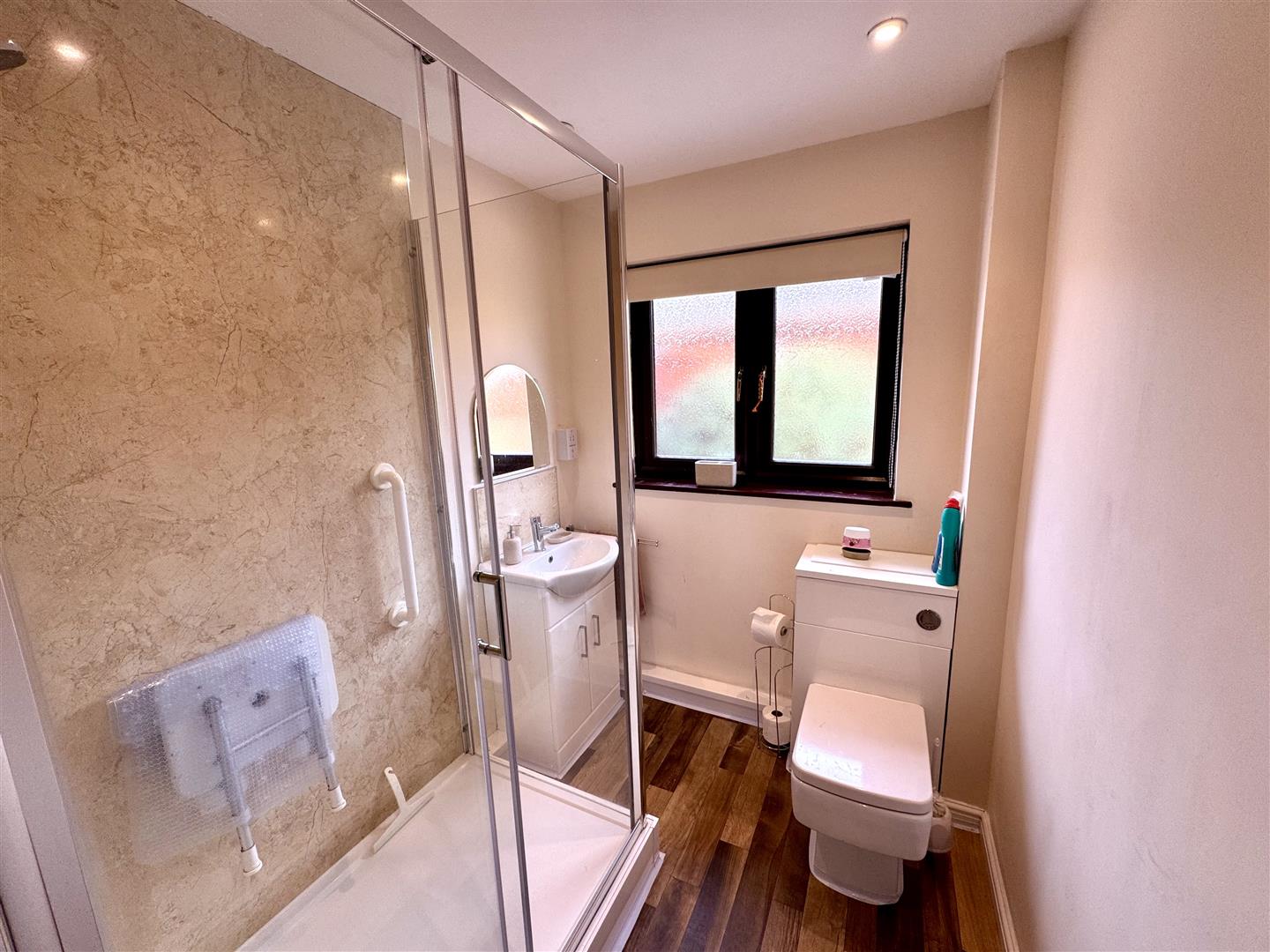 Comprising a low-level WC and a wash hand basin inset to vanity unit. Fully tiled walls. Heated towel rail. Wood effect laminate floor. Frosted window to the side elevation.