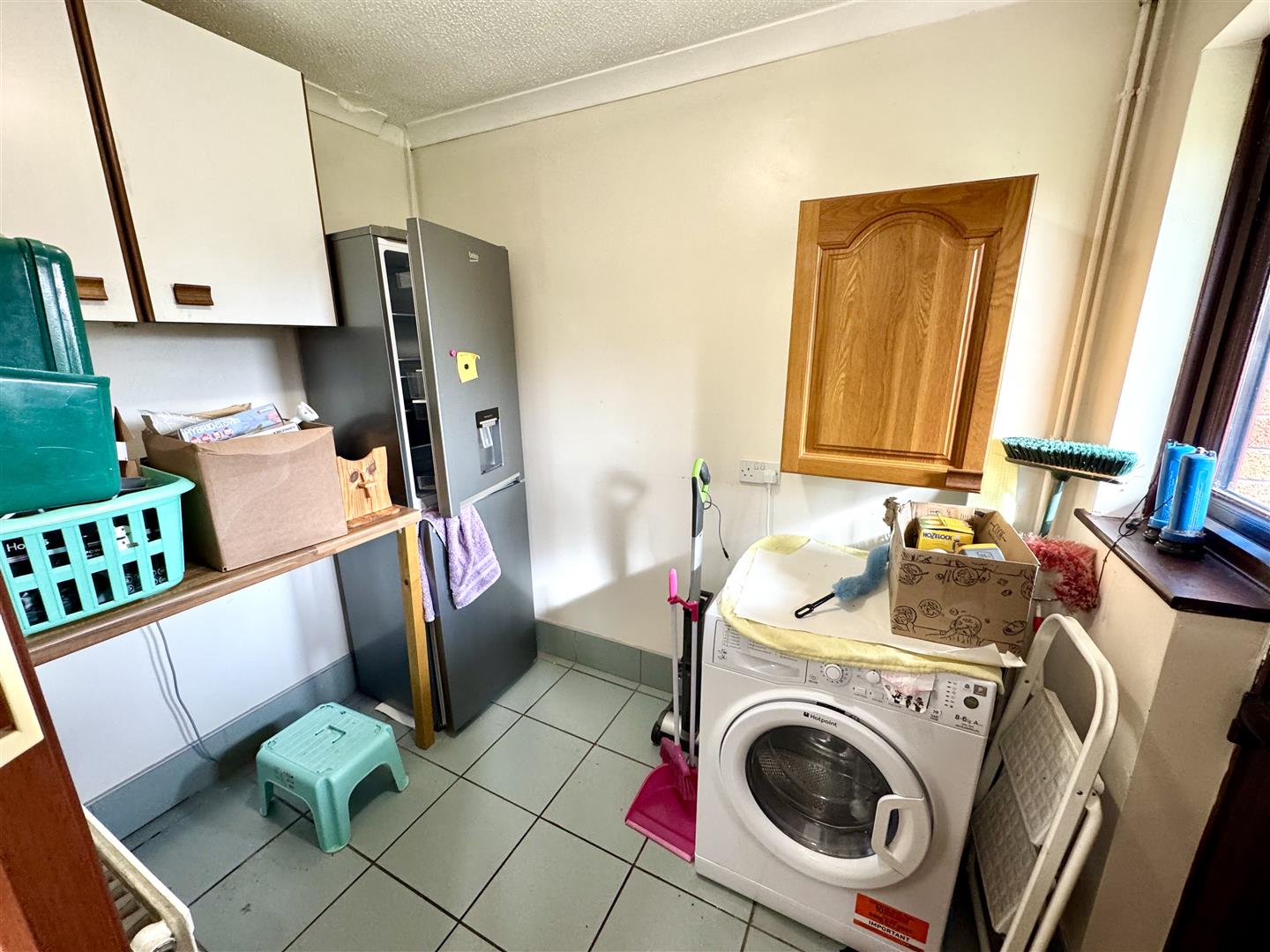 A really useful space with fitted units and worktops. Tiled floor. Space and plumbing for washing machine. Stable door leading out to the side garden.