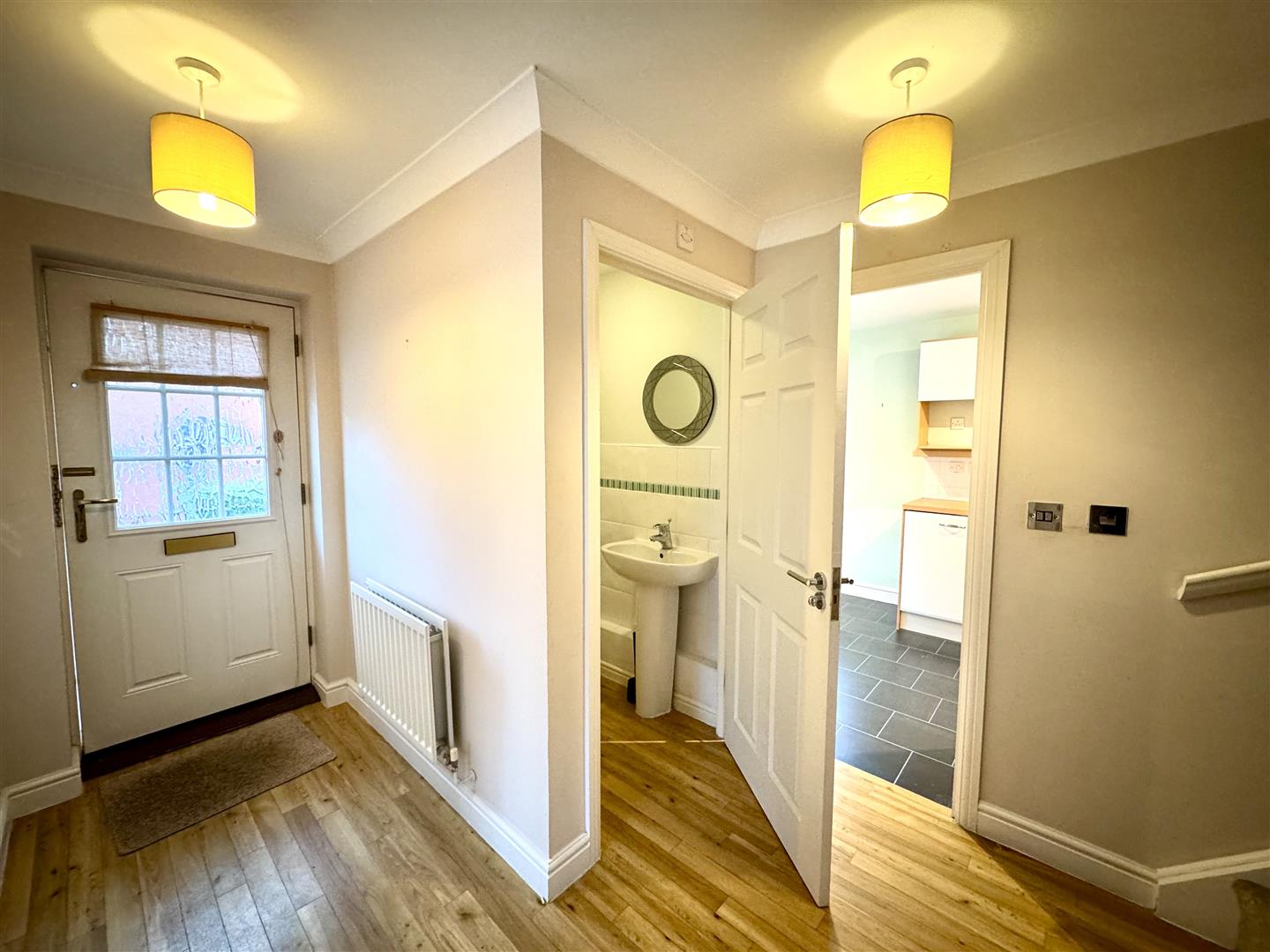A half-glazed front door leading to a spacious reception hall with wood effect flooring. Stairs to first floor and understairs storage cupboard.