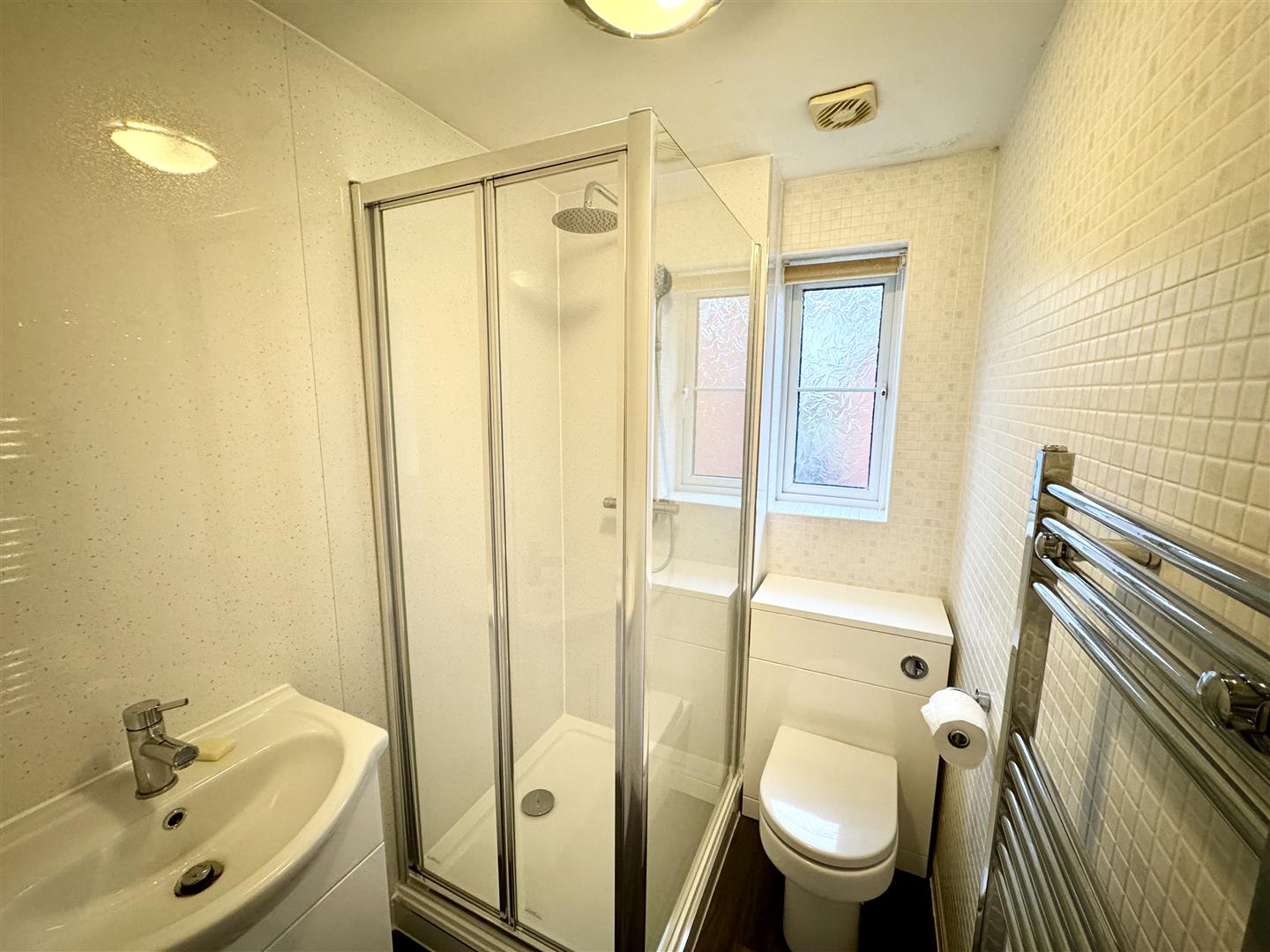 A modern shower room with frosted window to rear elevation. Comprising a low-level WC, wash hand basin inset to vanity storage unit with chrome mixer tap, and shower unit with chrome shower attachment and rainfall overhead shower with panelled walls. Chrome heated towel rail. Fully tiled walls, and wood effect flooring.