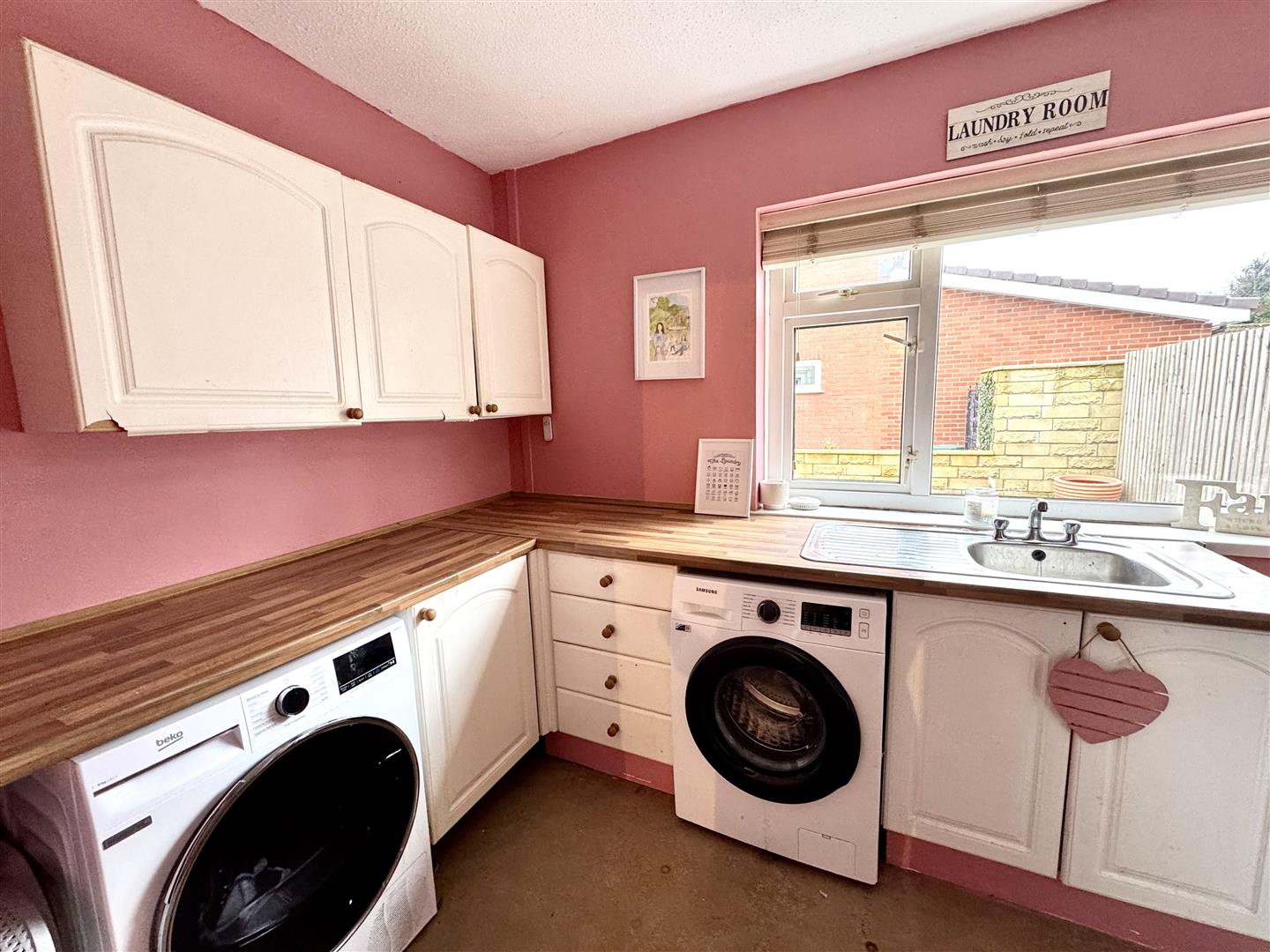 Appointed with a range of eye and base level units with laminate worktops and inset stainless steel sink and drainer with chrome mixer tap. Space for under counter washing machine and tumble dryer. Window to side elevation.