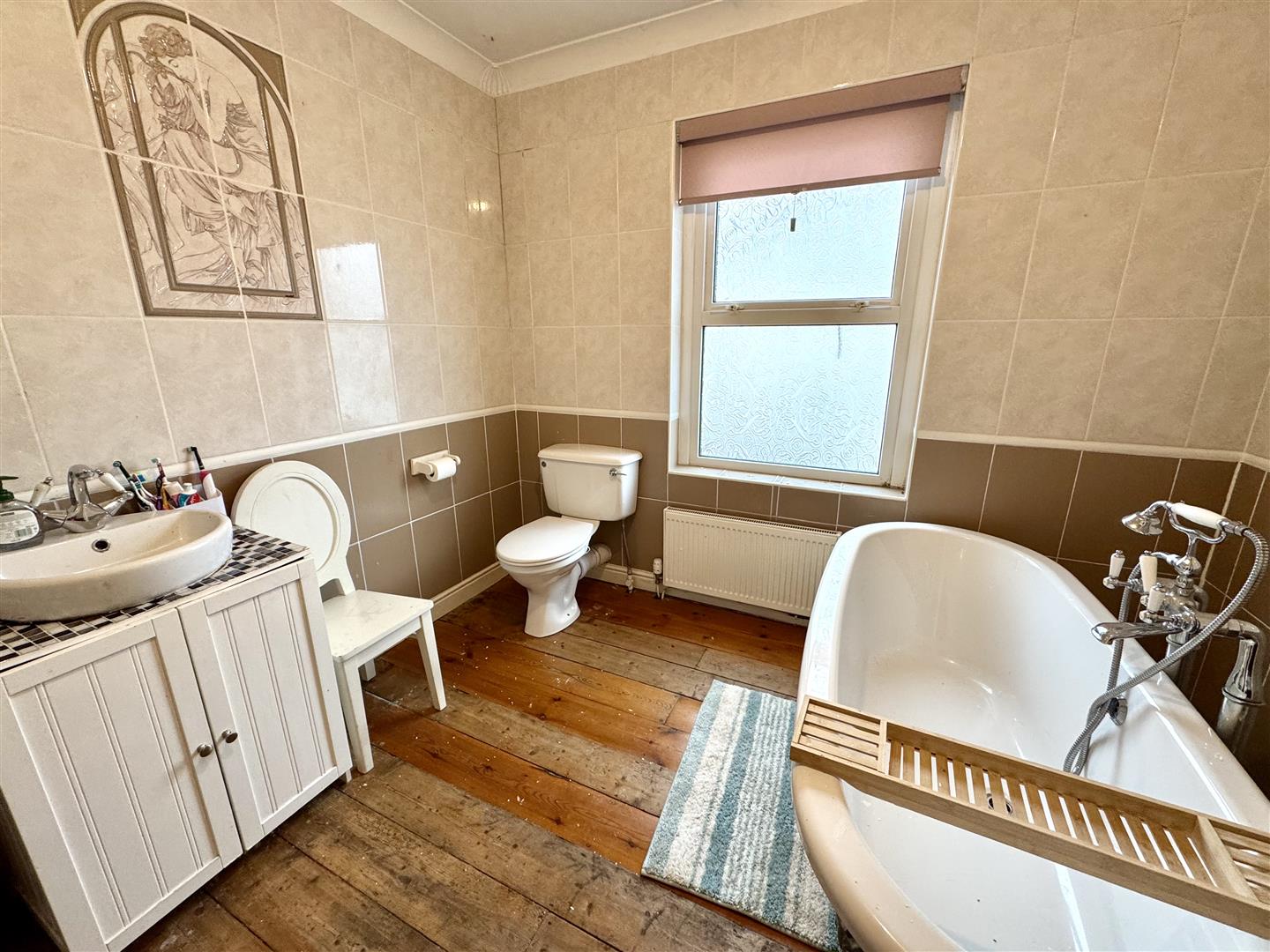 Comprising of a four-piece suite to include wash hand basin inset to vanity storage unit with chrome mixer tap, low-level WC, free standing bath with claw feet and chrome mixer tap with handheld shower attachment, and a single shower unit. Wooden flooring and fully tiled walls. Frosted window to side elevation.
