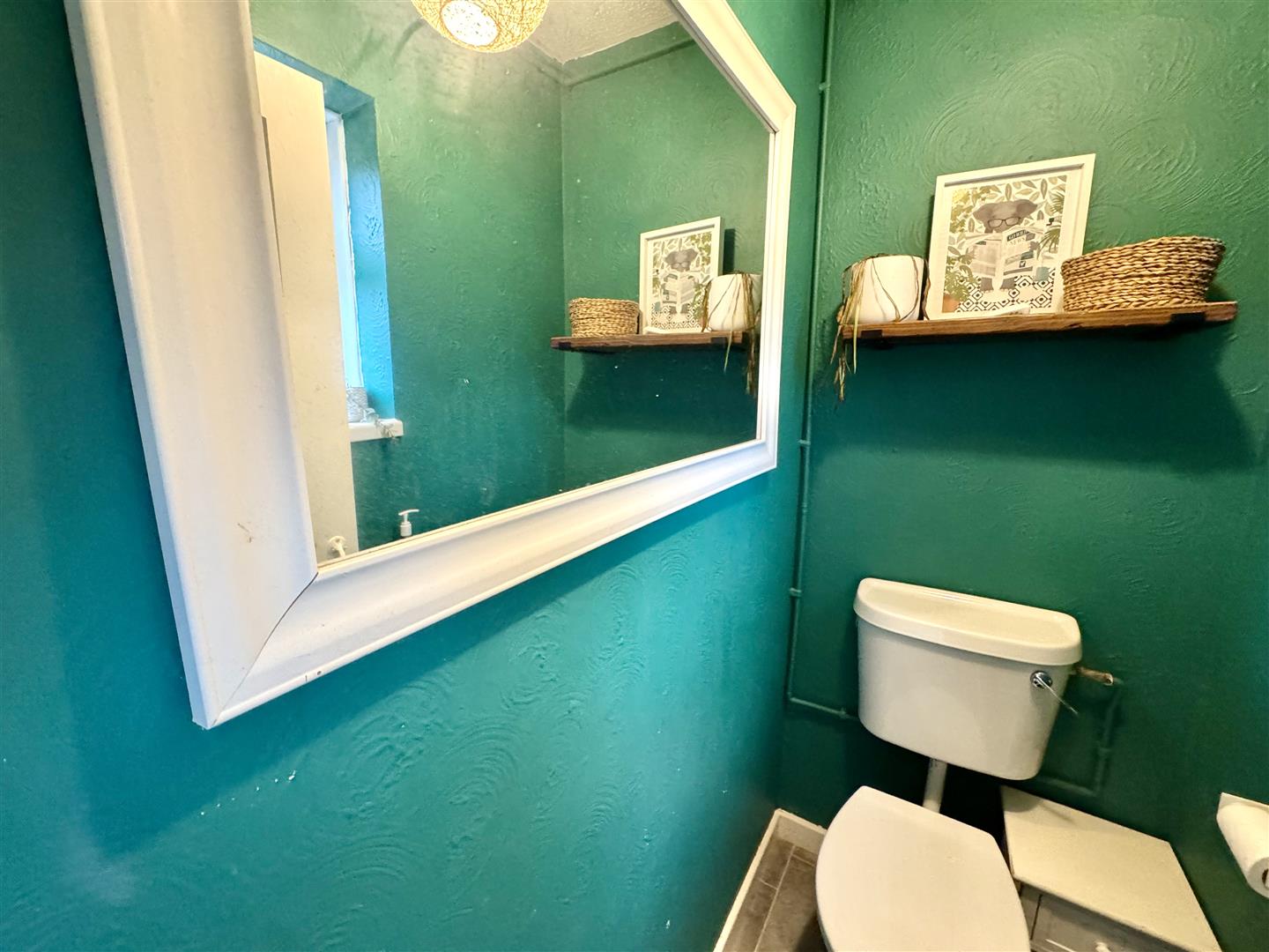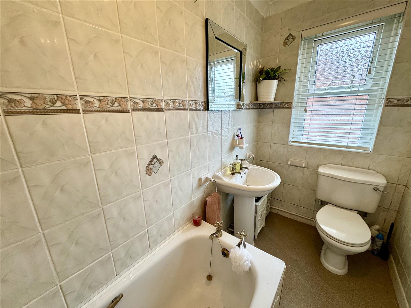Comprising of a three-piece suite to include a panelled bath with brass taps and electric shower over, pedestal wash hand basin with brass taps, and a low-level WC. Fully tiled walls. Frosted window to side elevation.
