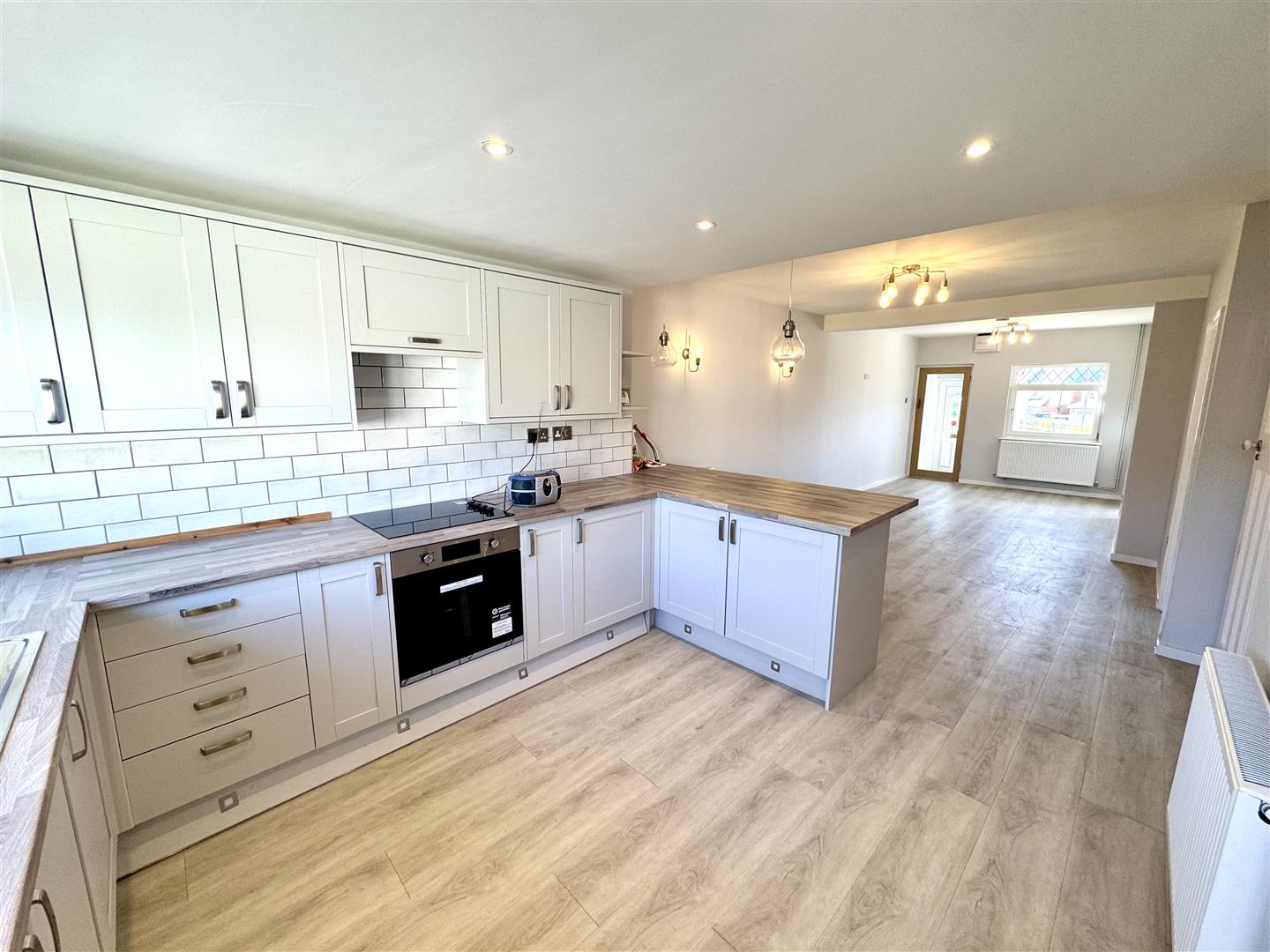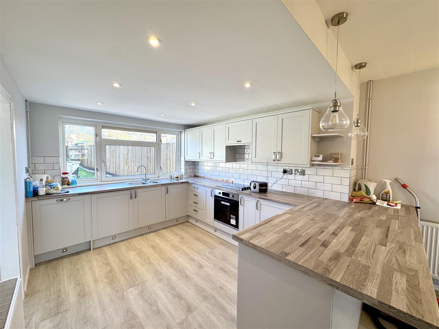 Comprising an extensive range of fitted wall and base units with ample wood effect laminate worktops and tiled splashbacks with inset one and half bowl stainless steel sink and drainer. Feature peninsular/breakfast bar provides an additional worktop space and space for eating and entertaining. Integrated appliances to include four ring Lamona electric hob with concealed extractor hood over and electric oven/grill beneath, integrated full size dishwasher, washing machine, fridge and separate freezer. Wood effect laminate floor. Window to rear elevation affording views across the private rear gardens and door to rear lobby.
