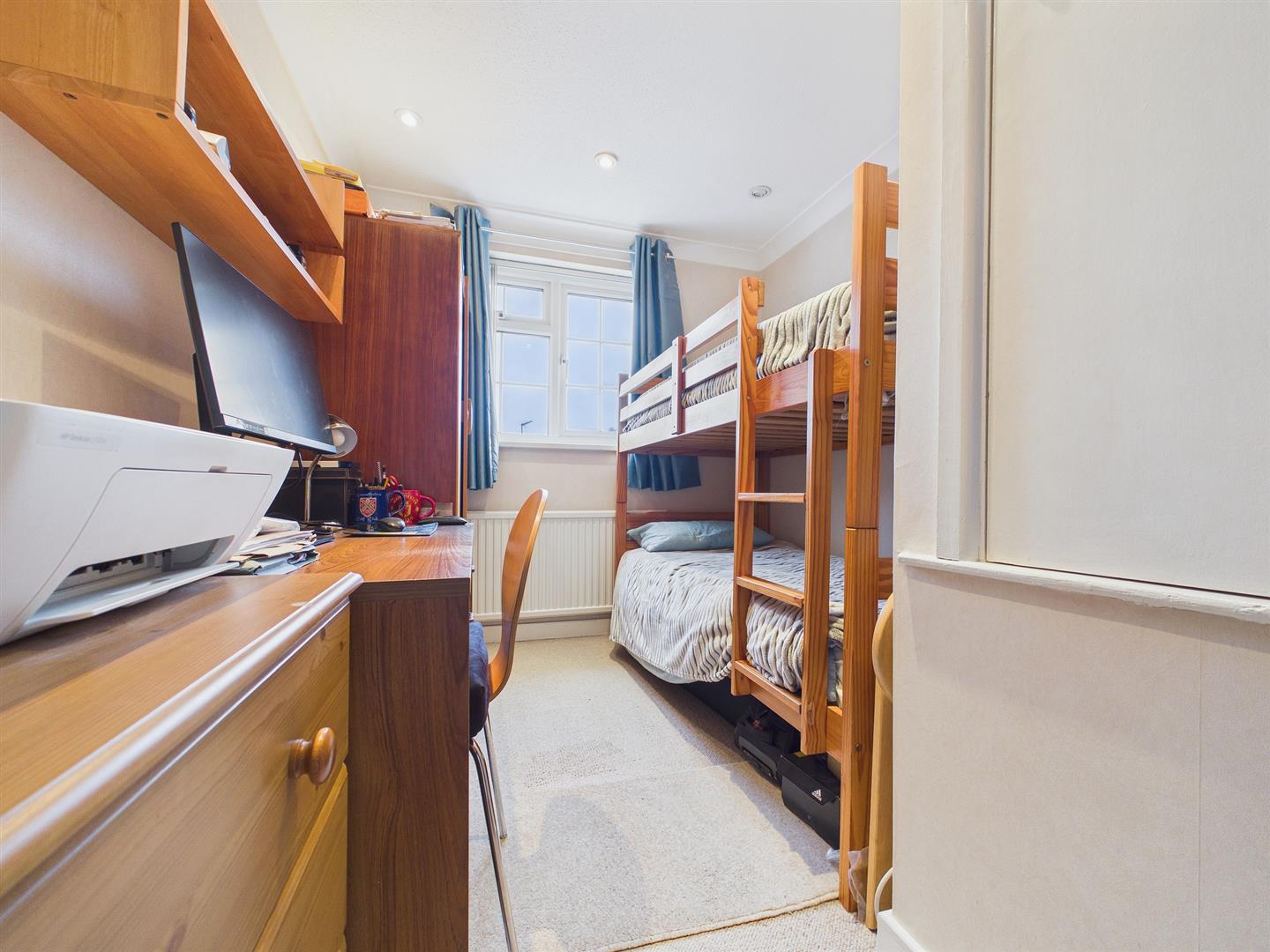 A spacious single bedroom, currently used as a home office. Handy over stair storage cupboard and window to front elevation.
