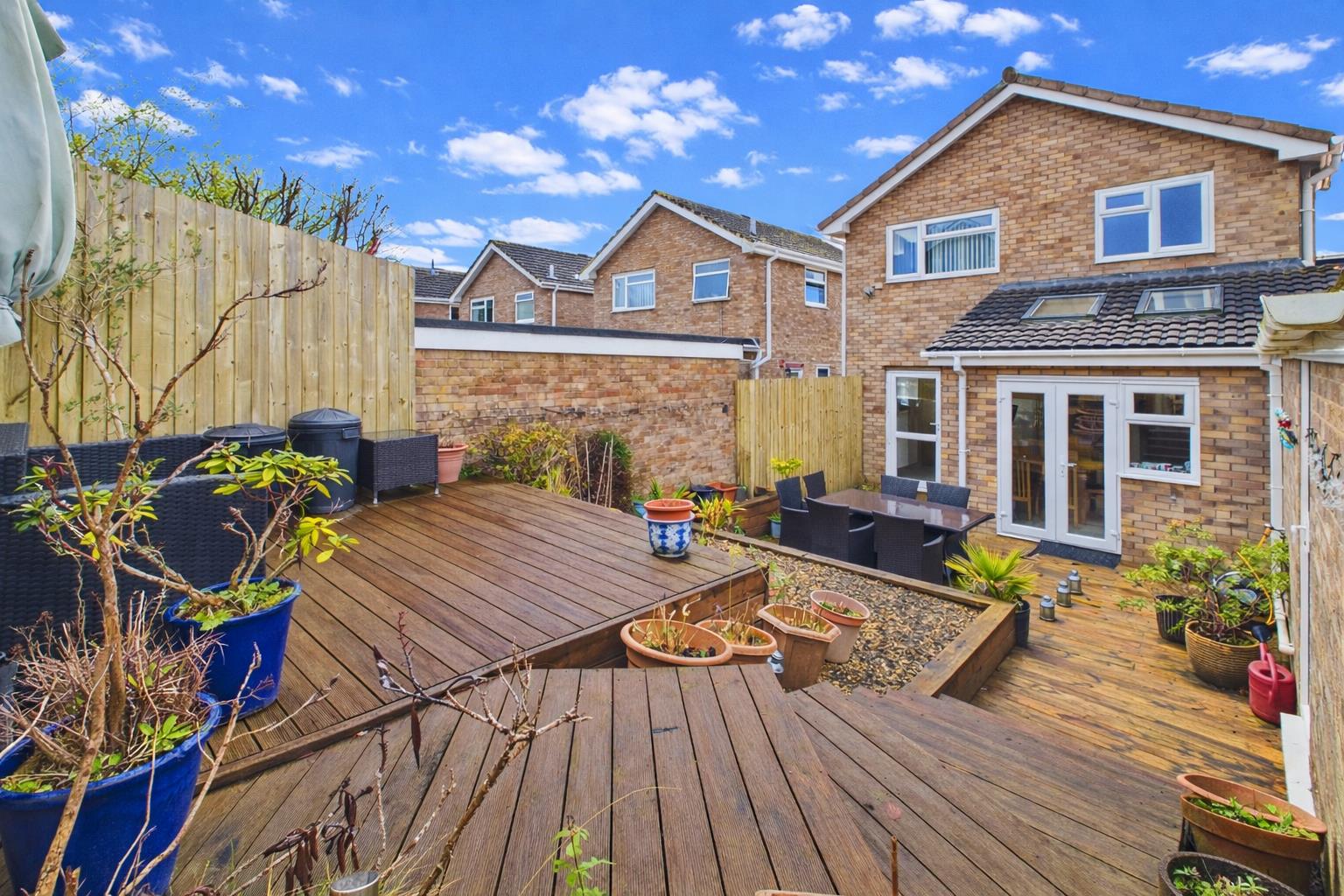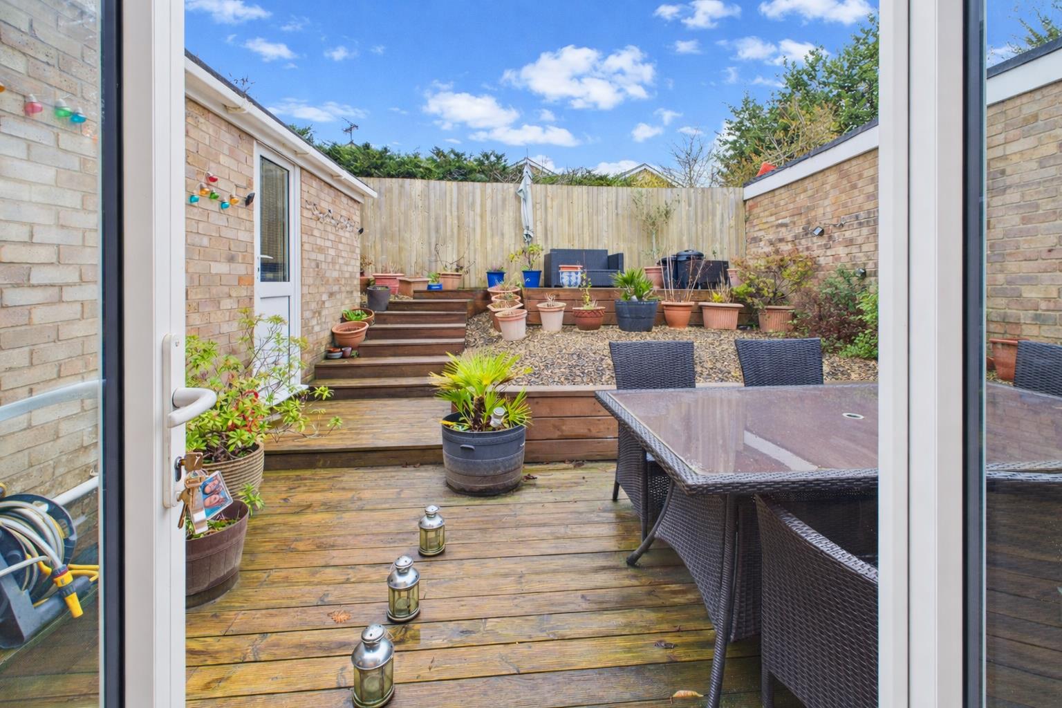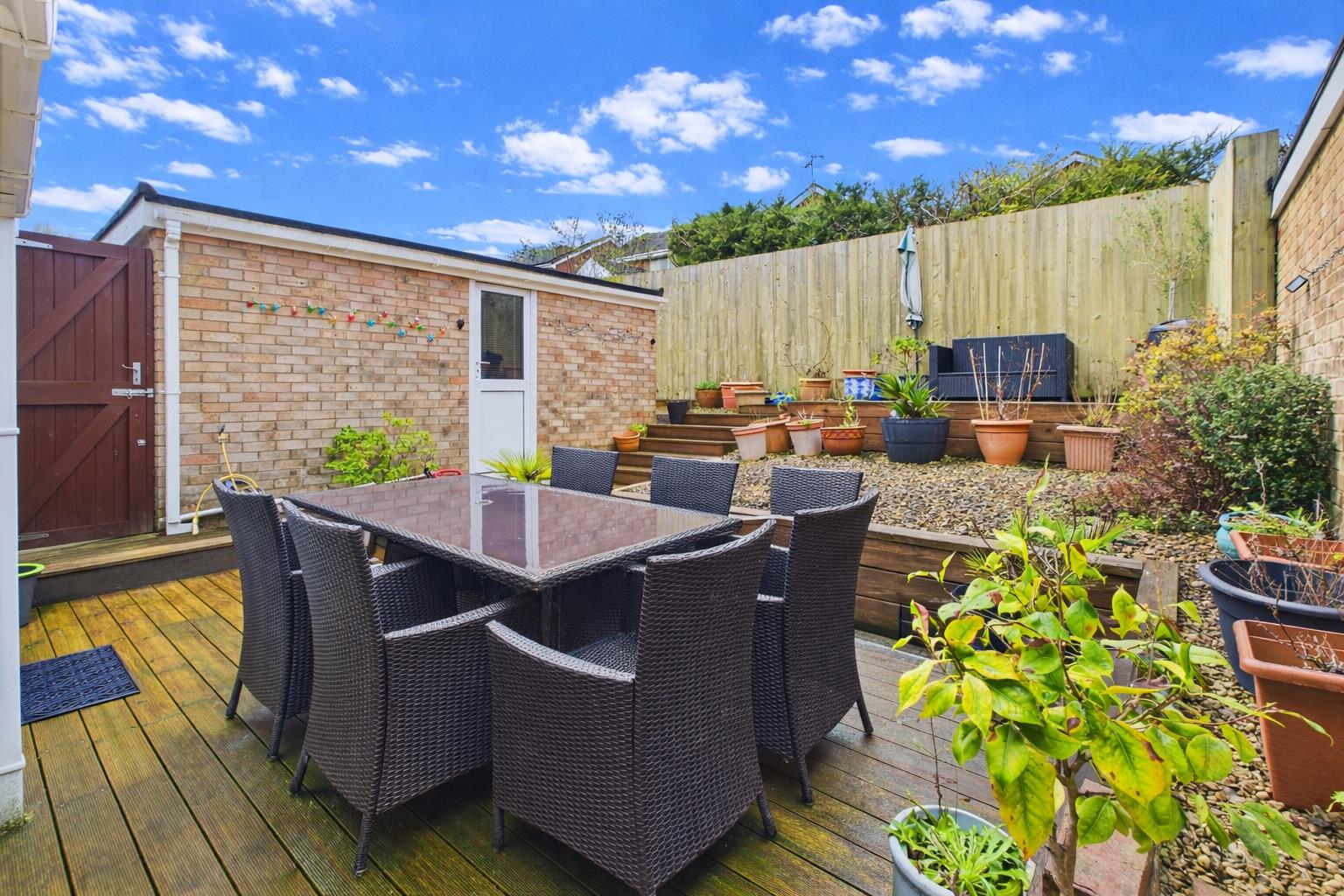 At the rear a generous terraced garden mainly laid to decking with raised stone border and gated access to the driveway. At the front there is a level garden mainly laid to lawn.
