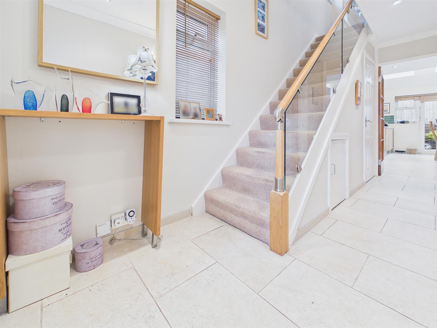 Half-glazed uPVC front door leads into the entrance hall with window to the side elevation. Ceramic tiled floor. Staircase to the first floor with oak and glass balustrade and handy under stairs storage cupboard.