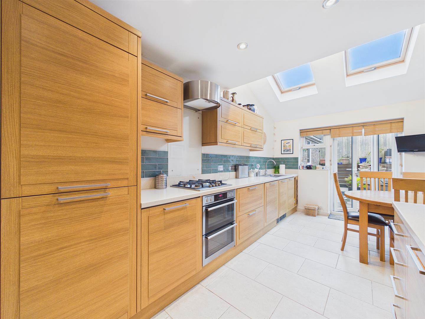 Well-appointed with an extensive range of base and eye level cupboards with ample marble effect worktops and upstand with tiled splashbacks. Inset one and a half bowl stainless steel sink with drainer and chrome mixer tap. Four ring gas hob with stainless steel extractor fan over with glass splashback and double oven beneath. Integrated fridge/freezer and dish washer. Space for a table and chairs. Two roof lights and French doors to rear garden. Ceramic tiled floor.