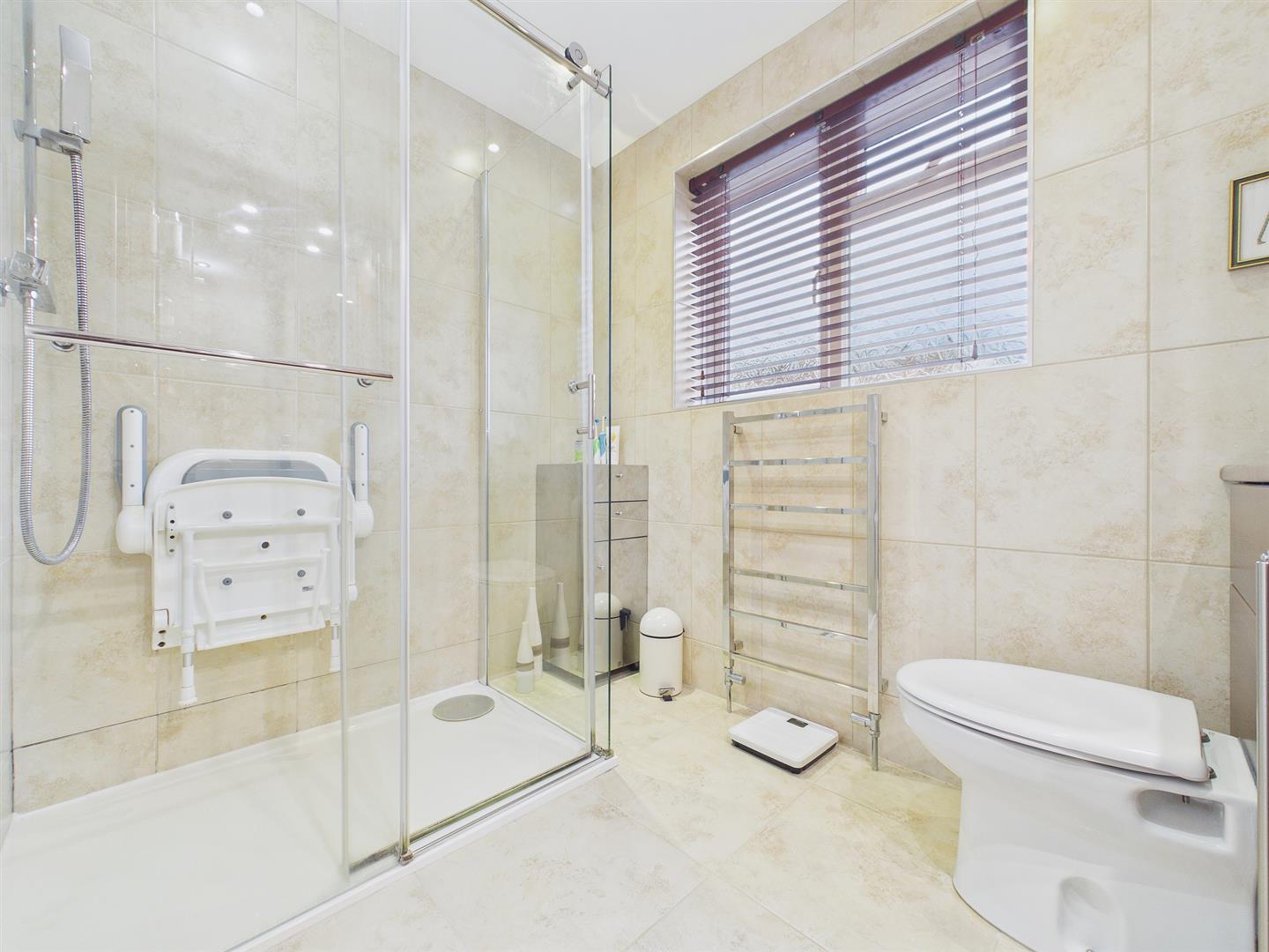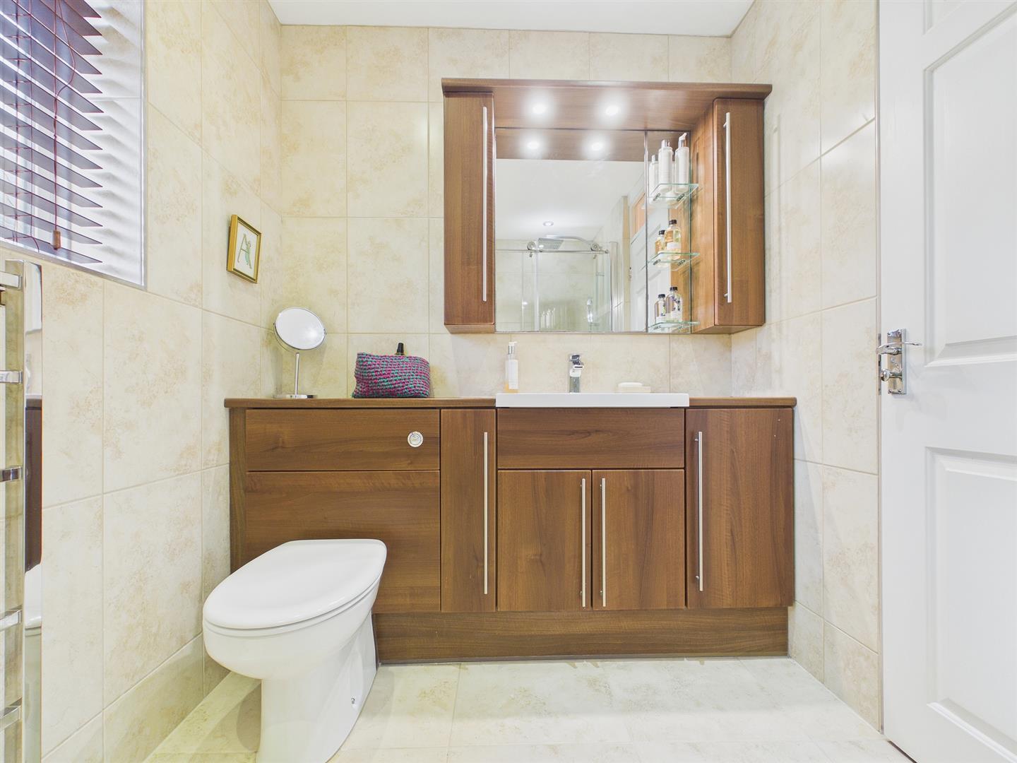 Appointed with a modern three-piece suite to include wash hand with chrome mixer tap inset to wooden effect storage along with concealed cistern low-level WC, and a double shower unit with glass sliding shower door, rainfall overhead shower plus handheld shower attachments. Chrome heated towel rail. Fully tiled walls and tiled floor. Frosted window to rear elevation.
