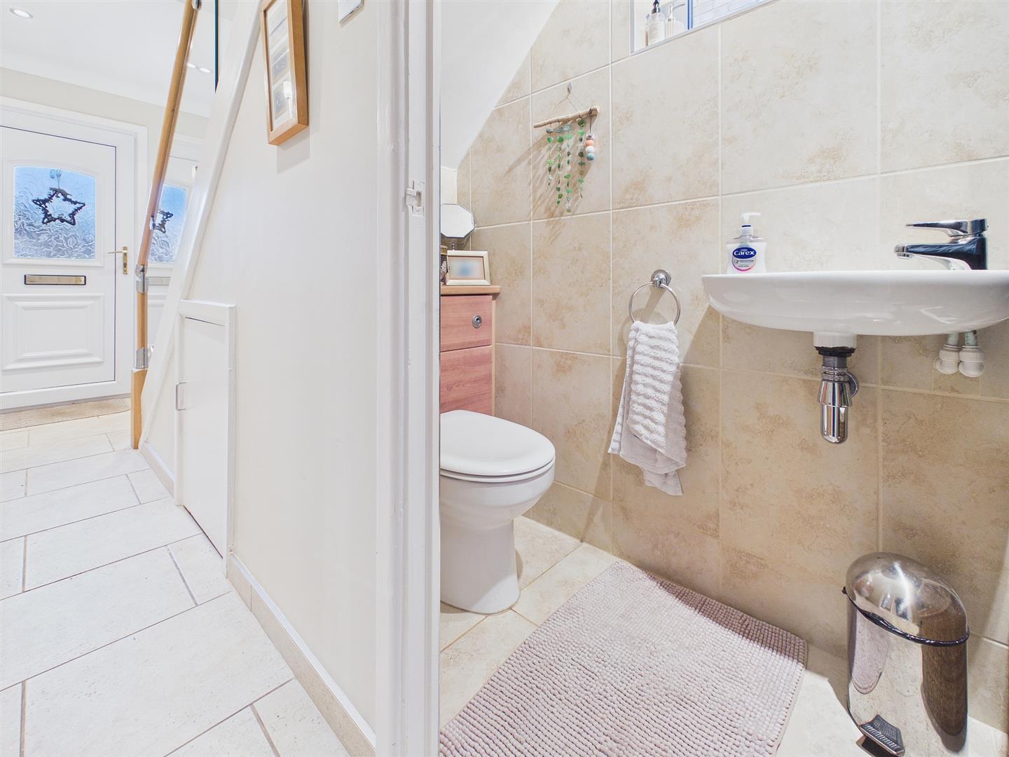 To include low-level WC and wall-mounted wash hand basin with chrome mixer tap. Fully tiled wall and floor. Window to side elevation.