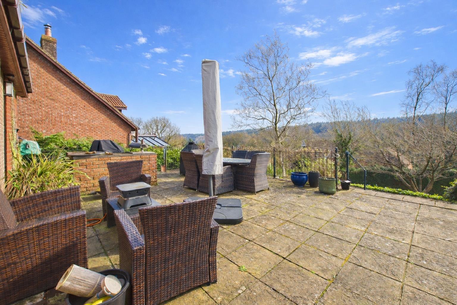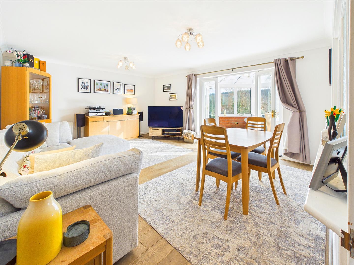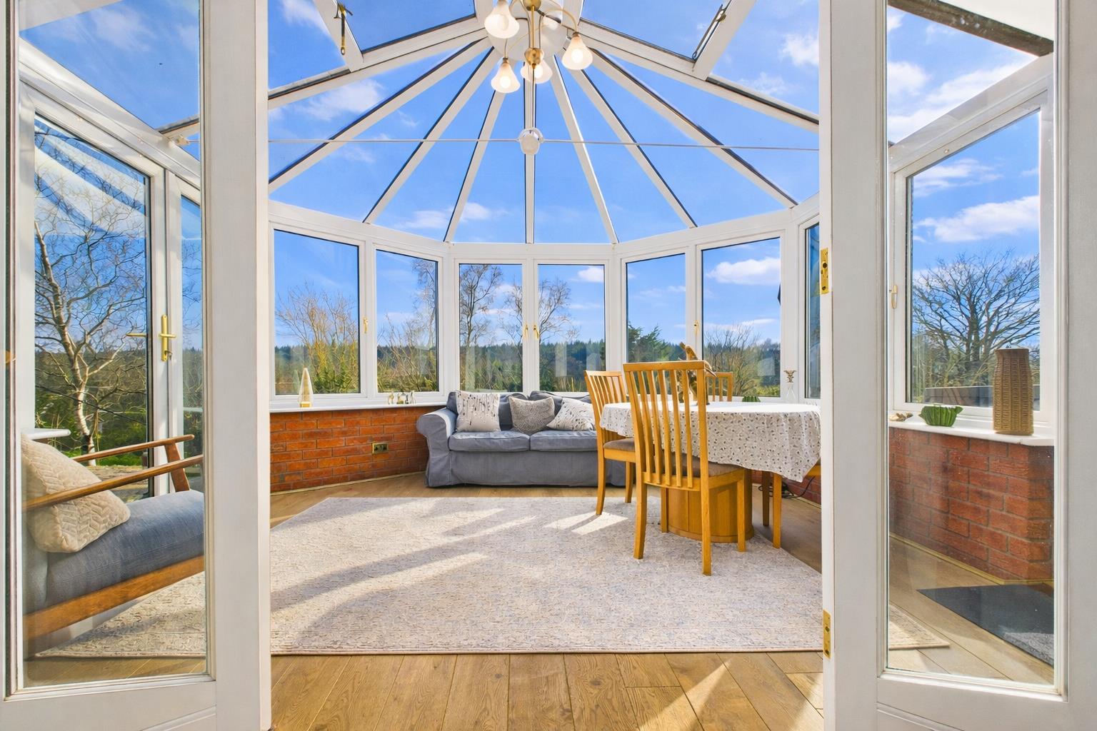 A fantastic further third reception space currently utilised as a dining/sitting room, fully double glazed with brick foundation. Wood effect laminate floor. French doors lead out to the sizeable paved patio area and a second pedestrian door leads to the paved terrace. An ideal all year round space to sit and enjoy views across the generous mature gardens.