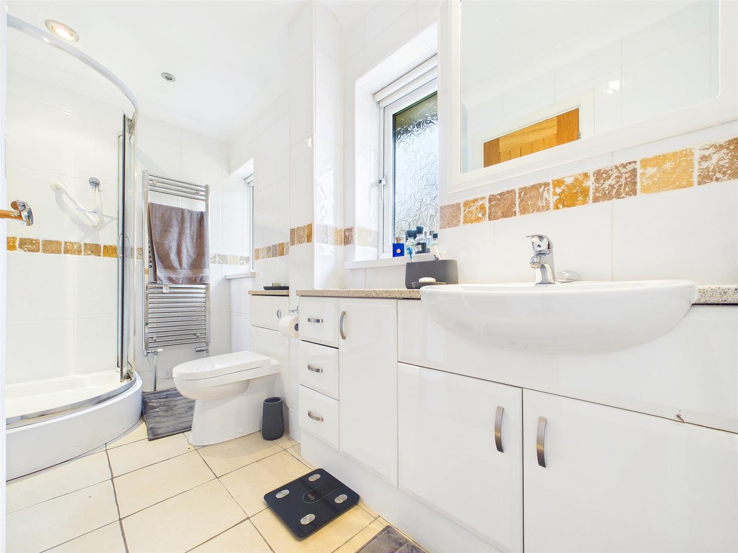 A good size en-suite with large corner walk-in shower cubicle with mains fed shower unit, low-level WC and wash hand basin with mixer tap inset to vanity storage unit. Heated towel rail. Tiled floor and fully tiled walls. Two frosted windows to the front elevation. Airing cupboard housing immersion tank, with inset shelving.