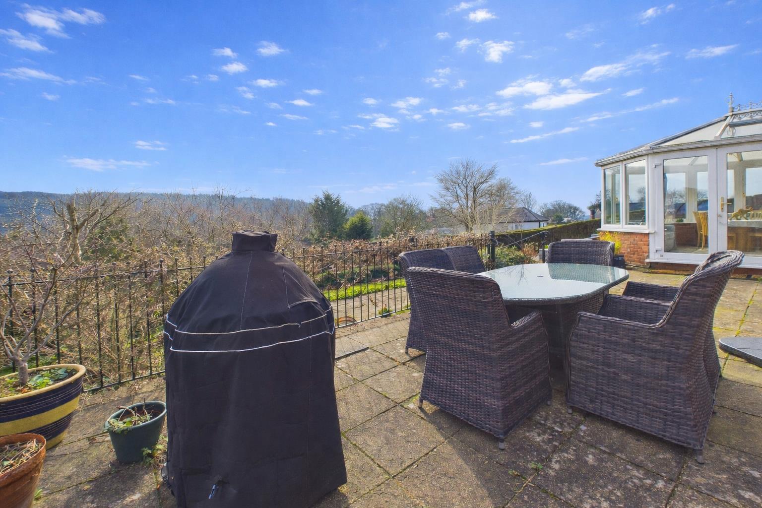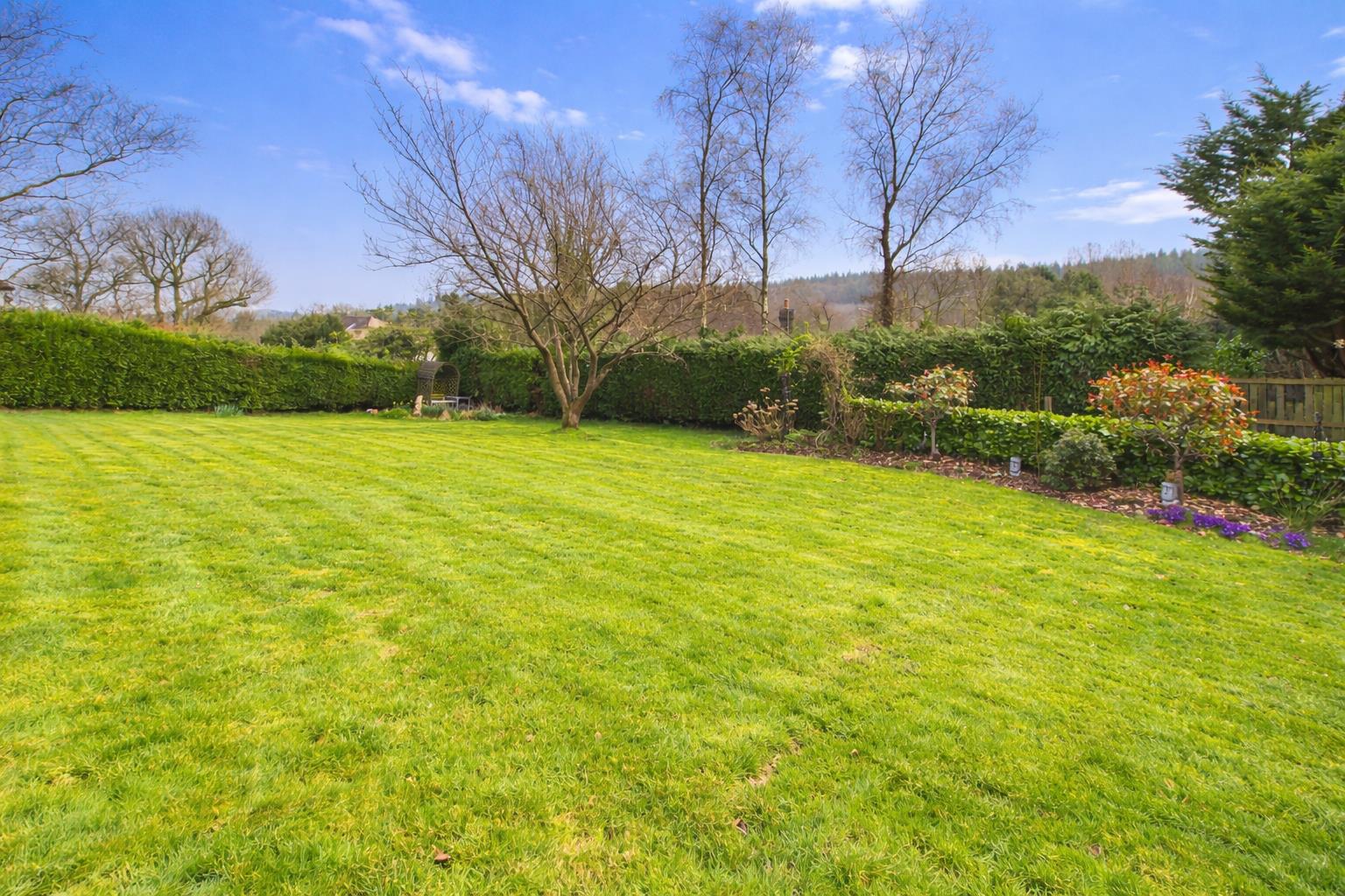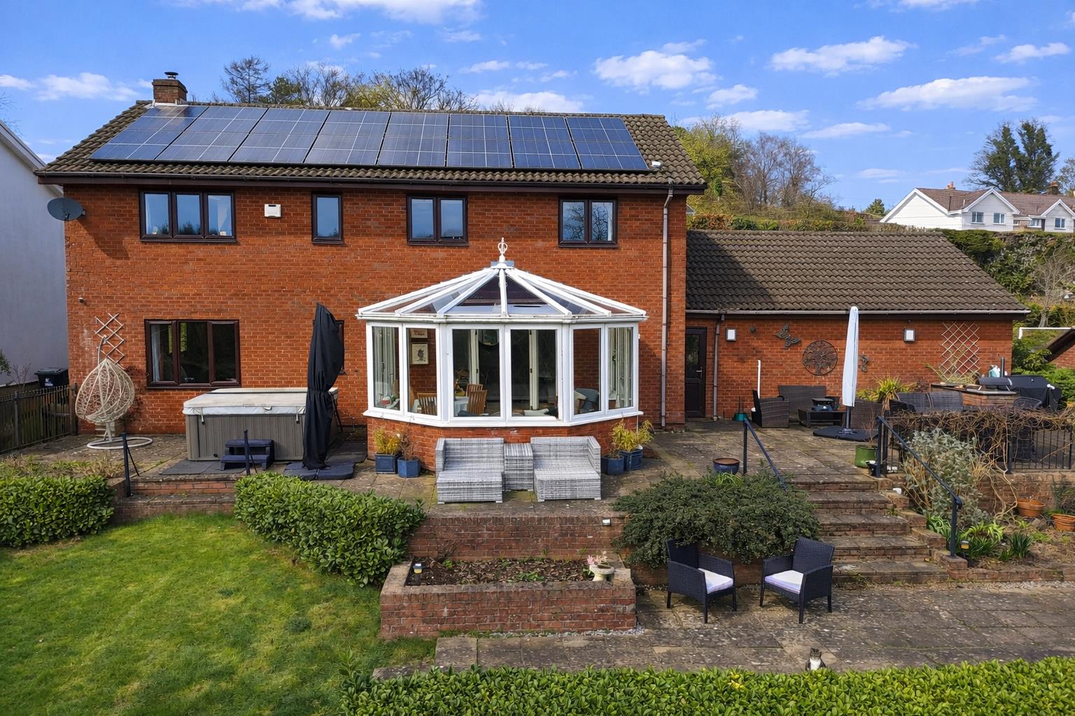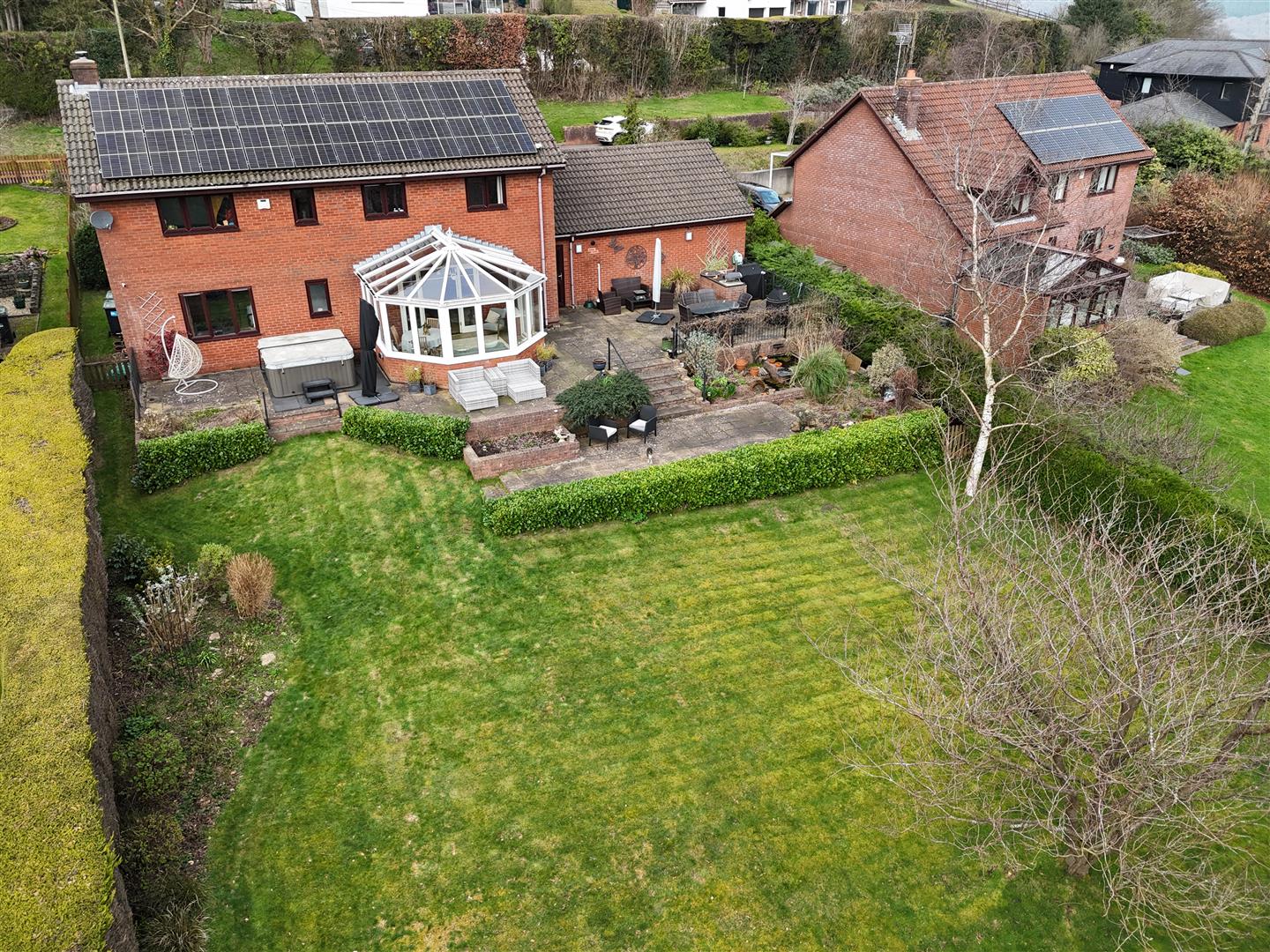 The gardens to the front are sizeable and low-maintenance, mainly laid to lawn with a range of mature plants and shrubs with a block paved pathway leading to the front entrance to the property. Gated pedestrian access to both sides of the property lead to the rear garden. The rear garden enjoys a sunny southerly aspect and comprises a sizeable paved patio area with brick built BBQ. The paved patio area wraps around the conservatory and spans the full width of the property providing a second area to sit and relax, or indeed house a hot tub as it currently does. Steps lead down from the paved patio area to a further level terrace bordered by a range of mature plants and shrubs as well as a feature pond and a sizeable gently sloping area mainly laid to lawn. At the rear of the garden there is a range of mature trees, plants and shrubs. The rear garden is fully enclosed by hedgerow to all sides.