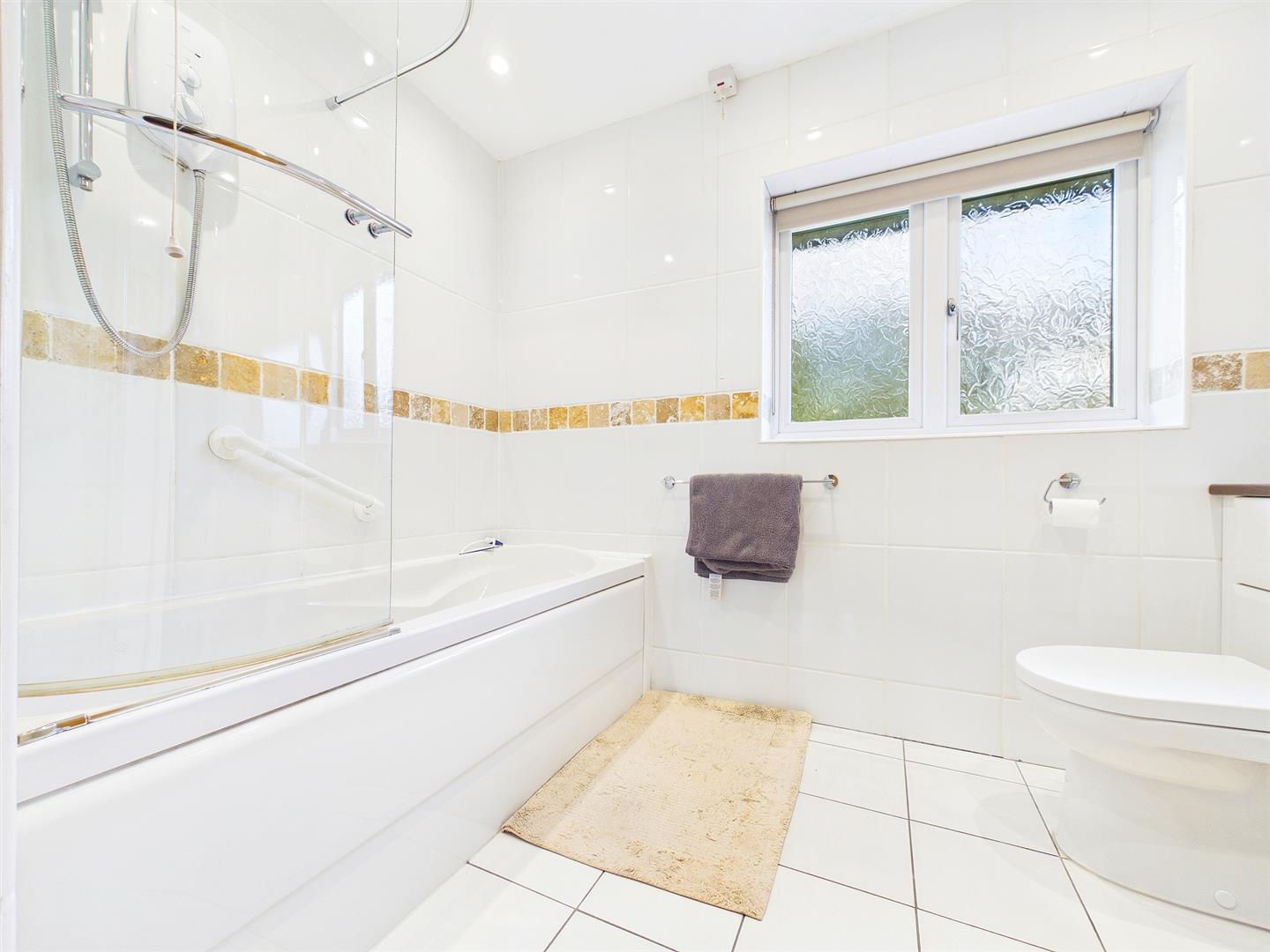 Comprising a modern neutral suite to include panelled bath with electric shower unit over and glass shower screen, low-level WC, and wash hand basin inset to vanity storage unit with mixer tap. Heated towel rail. Fully tiled walls and tiled floor. Frosted window to front elevation.