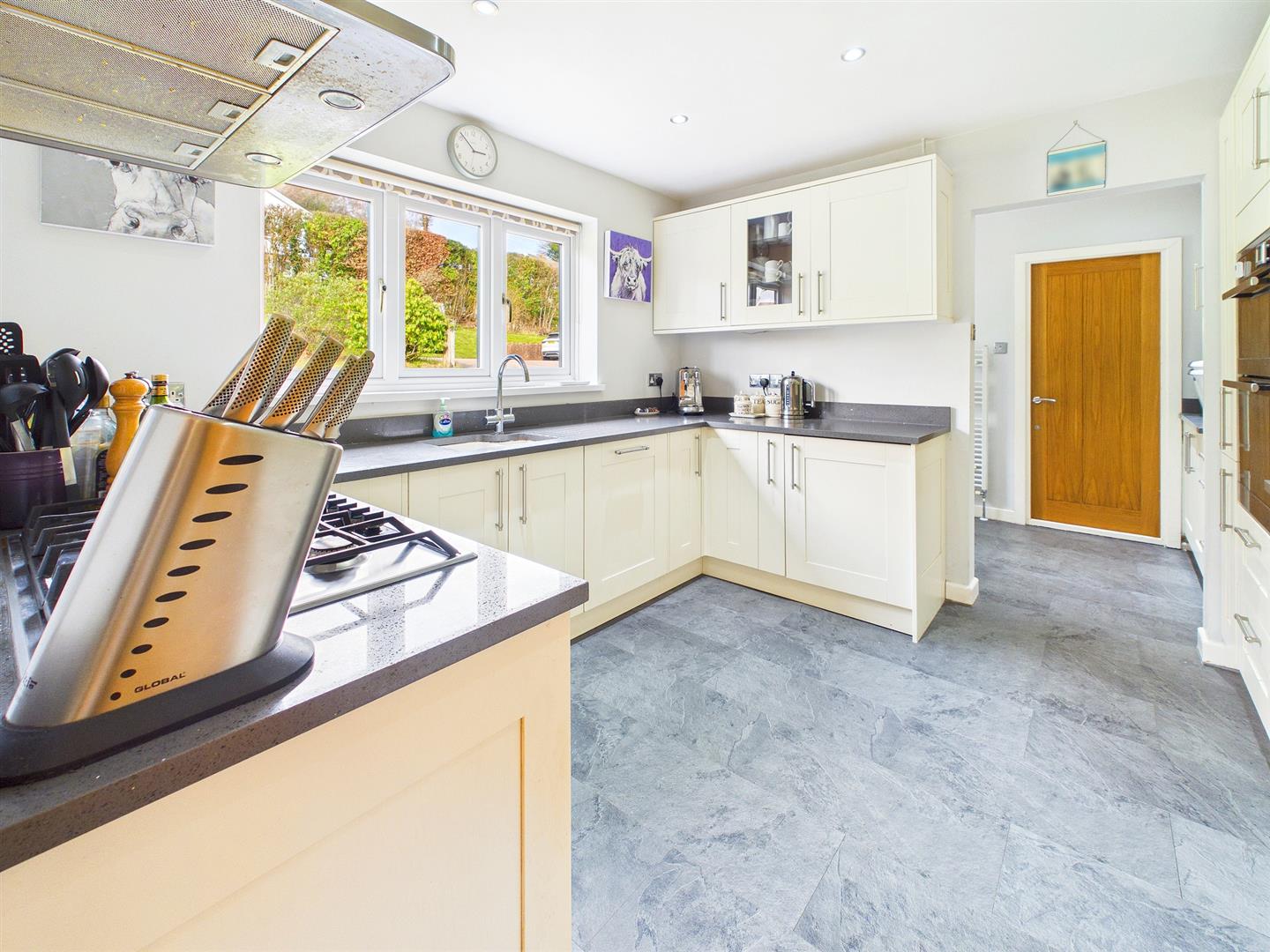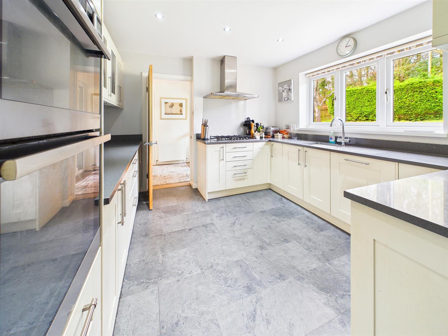 An extensive range of contemporary wall and base units with ample quartz worktop and inset ceramic sink with drainer and mixer tap. A range of integrated appliances to include five ring gas hob with feature extractor hood over, eye level double electric oven/grill and separate Neff microwave, integrated dishwasher and integrated under counter fridge/freezer. Tiled floor. Window to front elevation. Open archway to:-