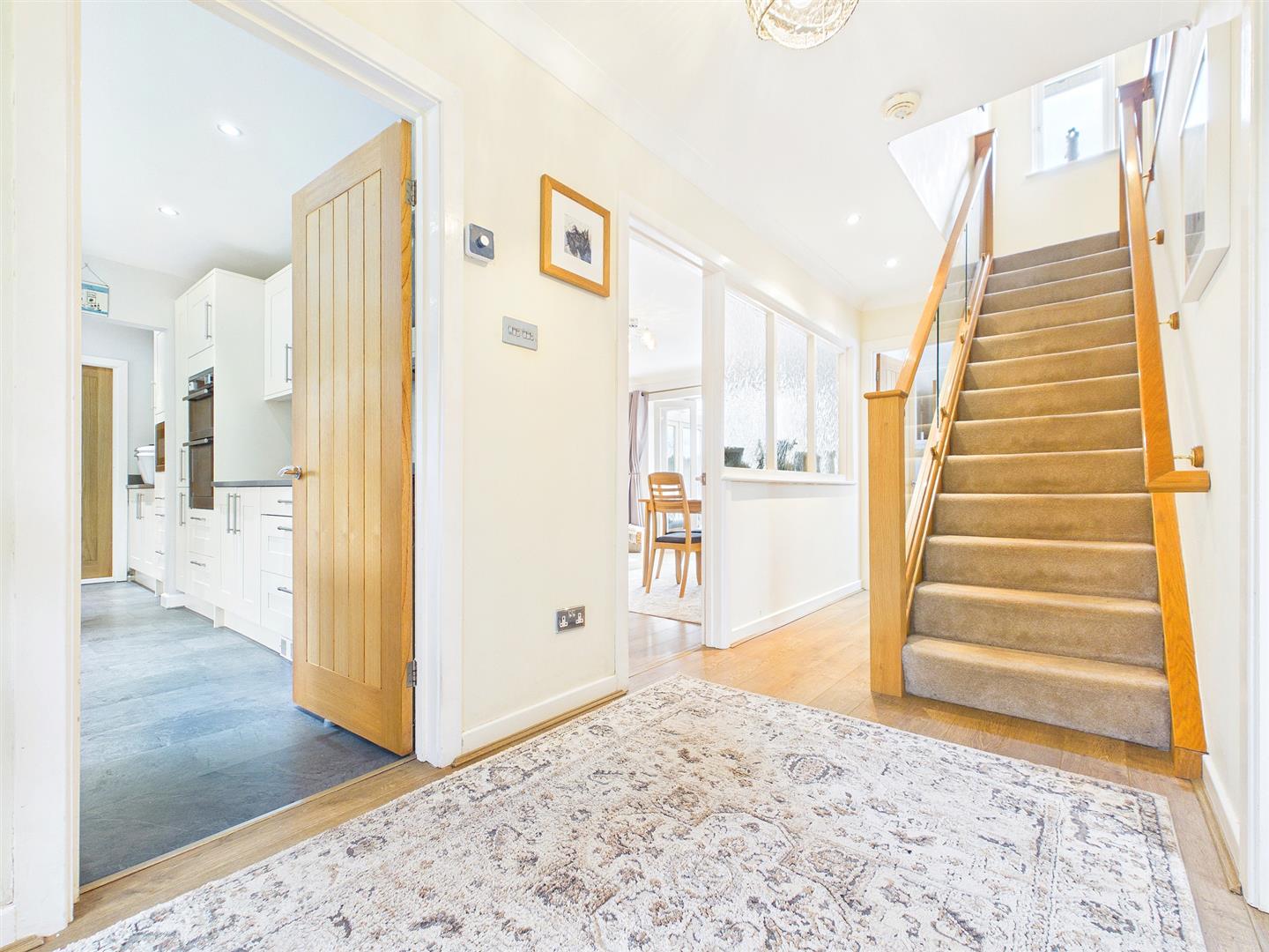 A welcoming reception hall with wood effect laminate floor. Staircase to first floor landing with feature Oak banister and glass balustrade. Useful understairs storage area.