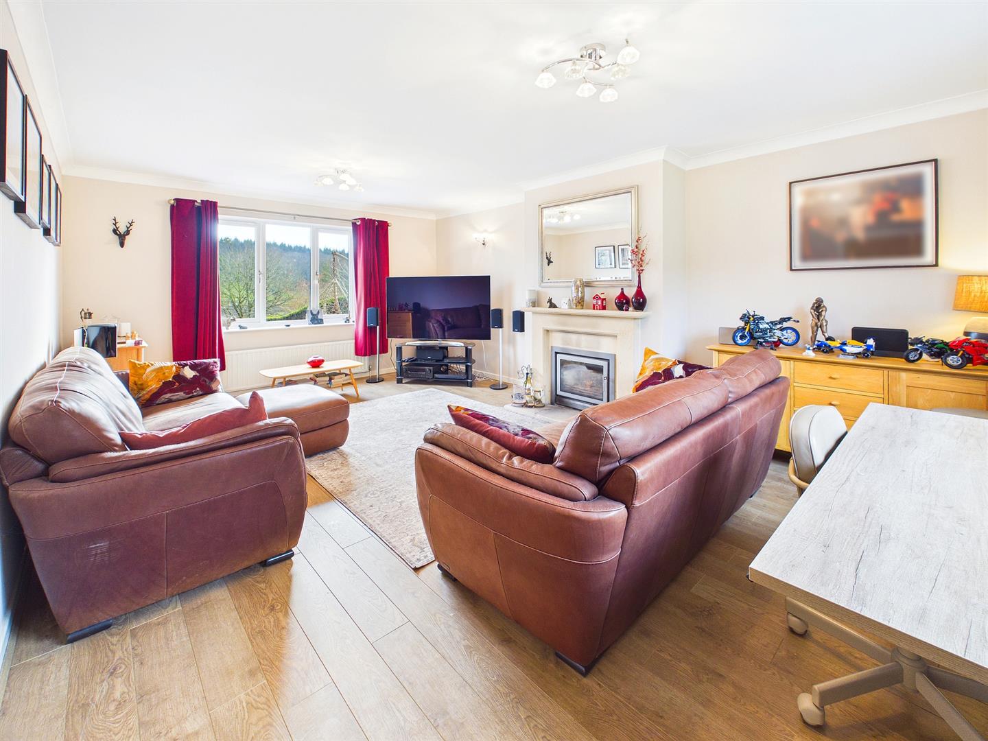 A fantastic reception room enjoying a dual aspect to the front and rear elevations. Wood effect laminate floor. Feature inset log burner with a flagstone hearth and marble surround.