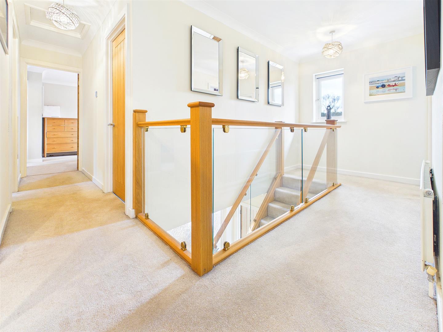 A spacious galleried landing area with feature glass balustrade with Oak banister and window to the rear elevation enjoying far reaching views. Loft access point.