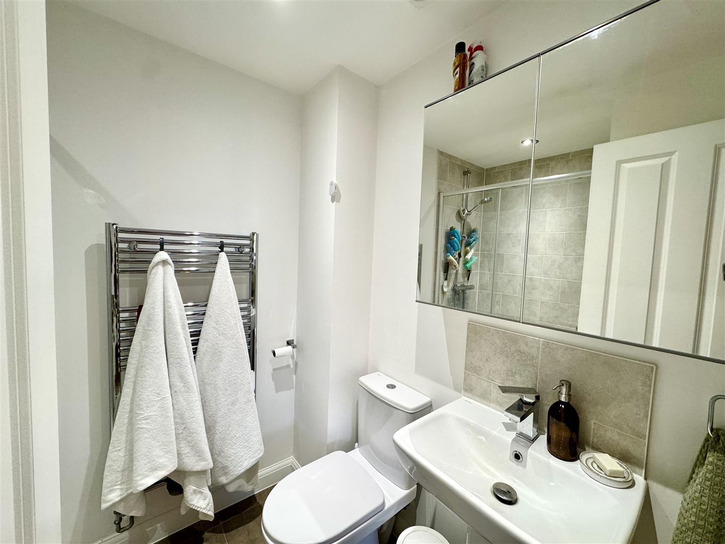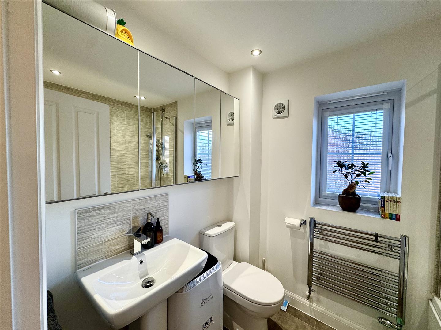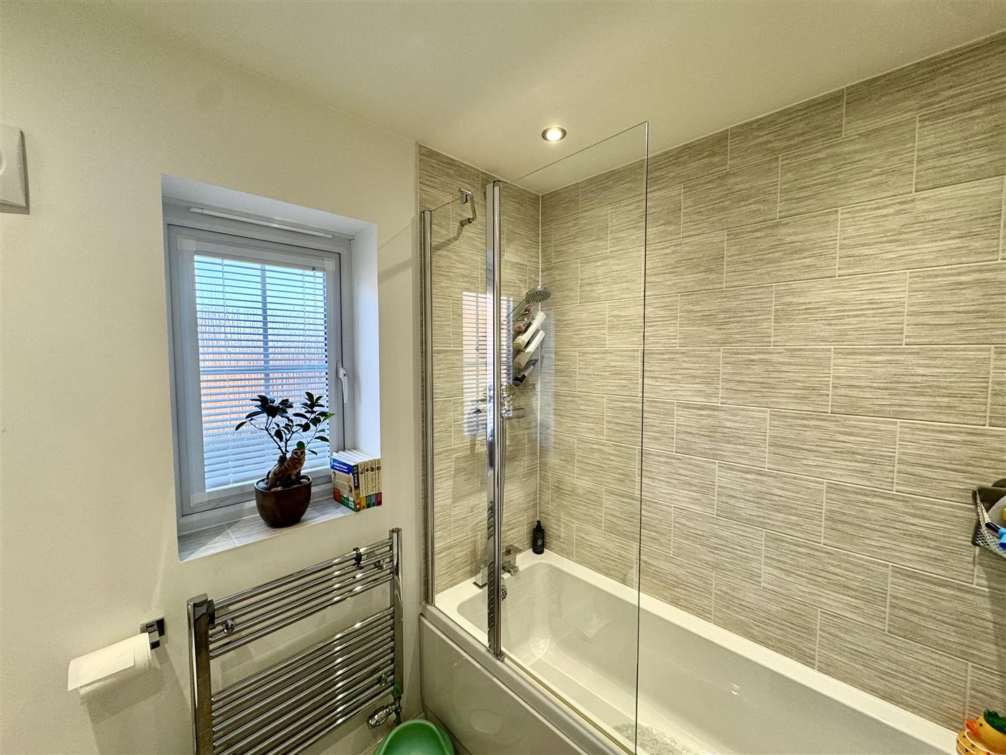 Comprising a neutral three-piece suite to include panelled bath with mains fed shower over and tiled surround, pedestal wash hand basin with mixer tap and low-level WC. Heated towel rail. Frosted window with fitted blinds to the side.
