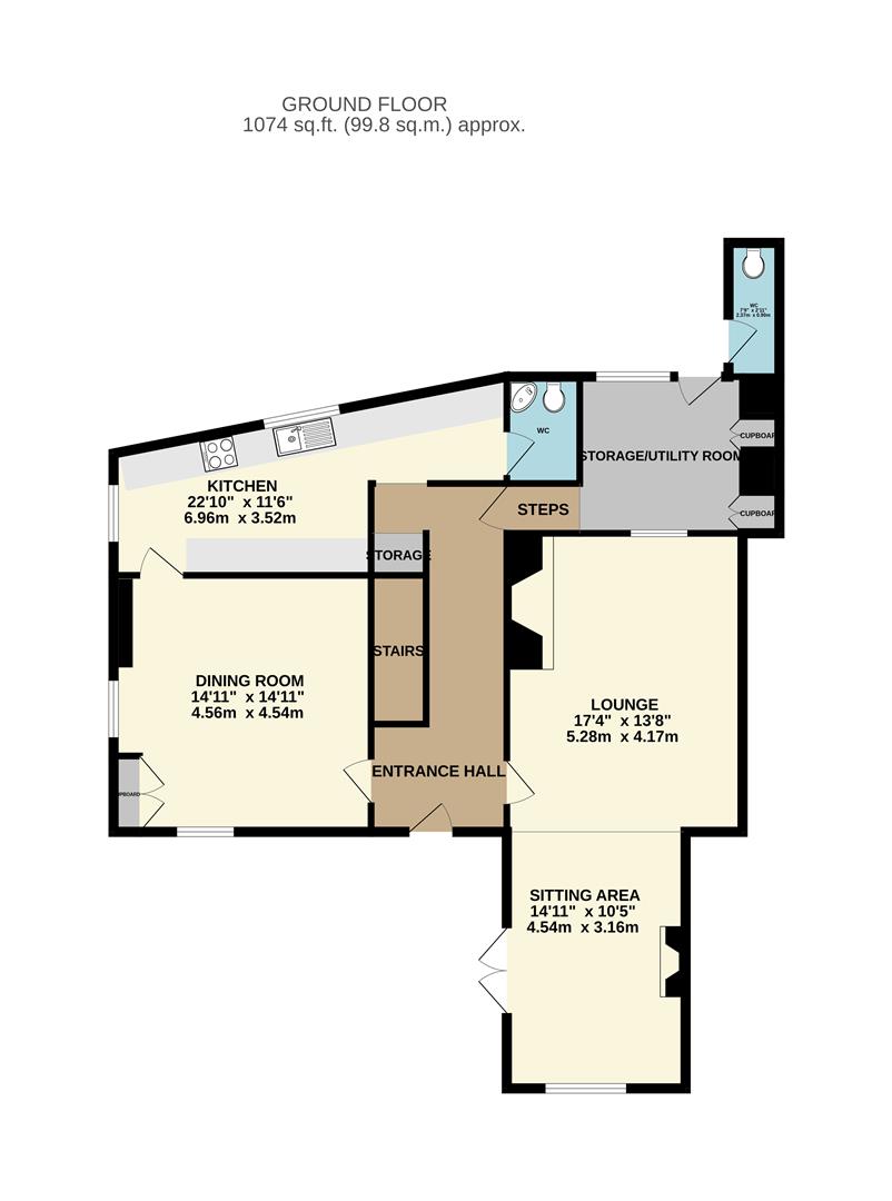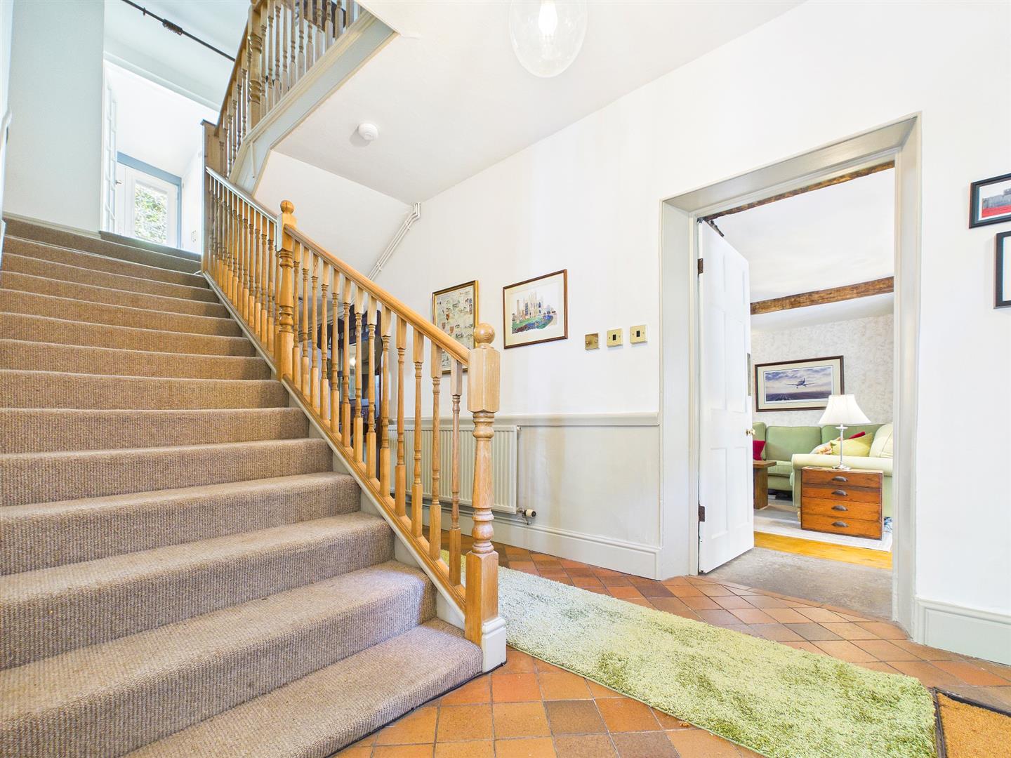 Entrance door leads through to a grand welcoming reception hall with feature quarry tiled floor and half-turned staircase leading to the first floor. Useful understairs storage area. Steps down to the storage/utility room.