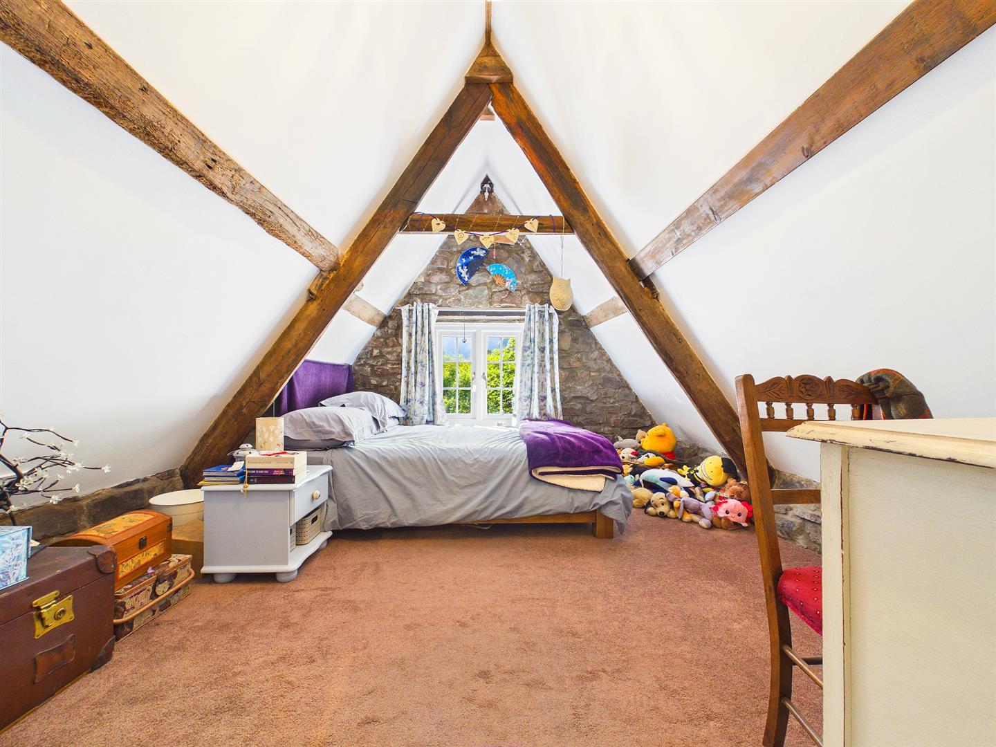 A double bedroom with a feature expose beam and stone wall. Window to front elevation.