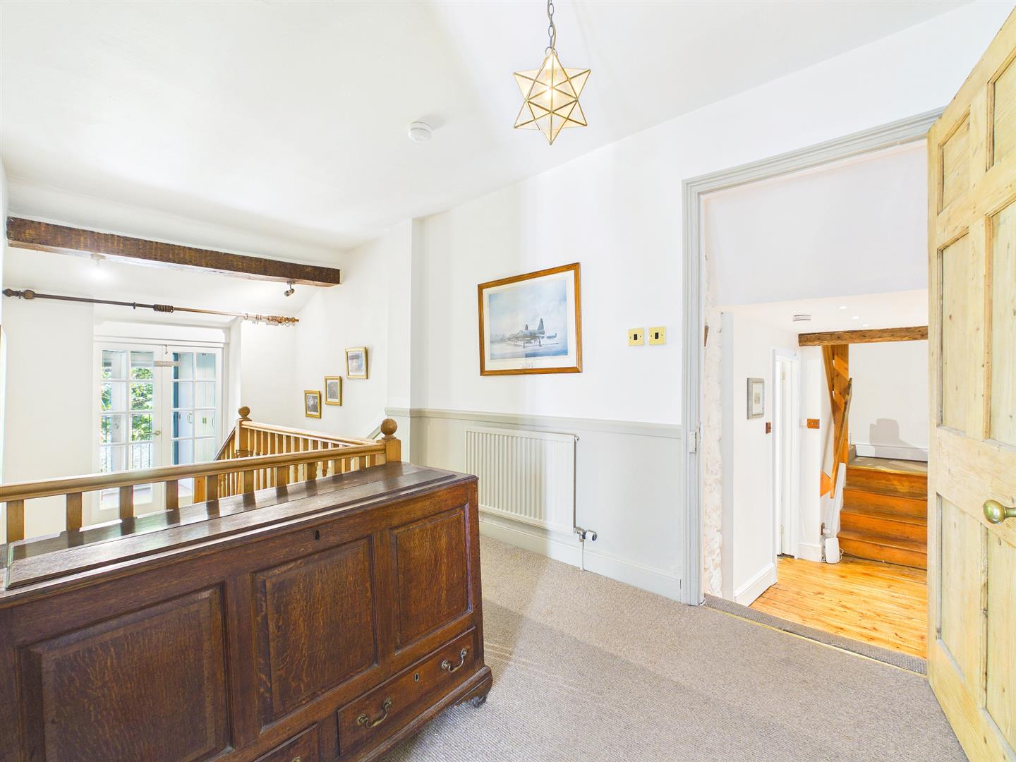 Stairs lead up to a split level landing where double doors lead to bedroom 4. The main landing has loft access point and half turned staircase to the second floor. An internal door with steps drop down to inner hallway with feature exposed floorboards giving access to the family bathroom.