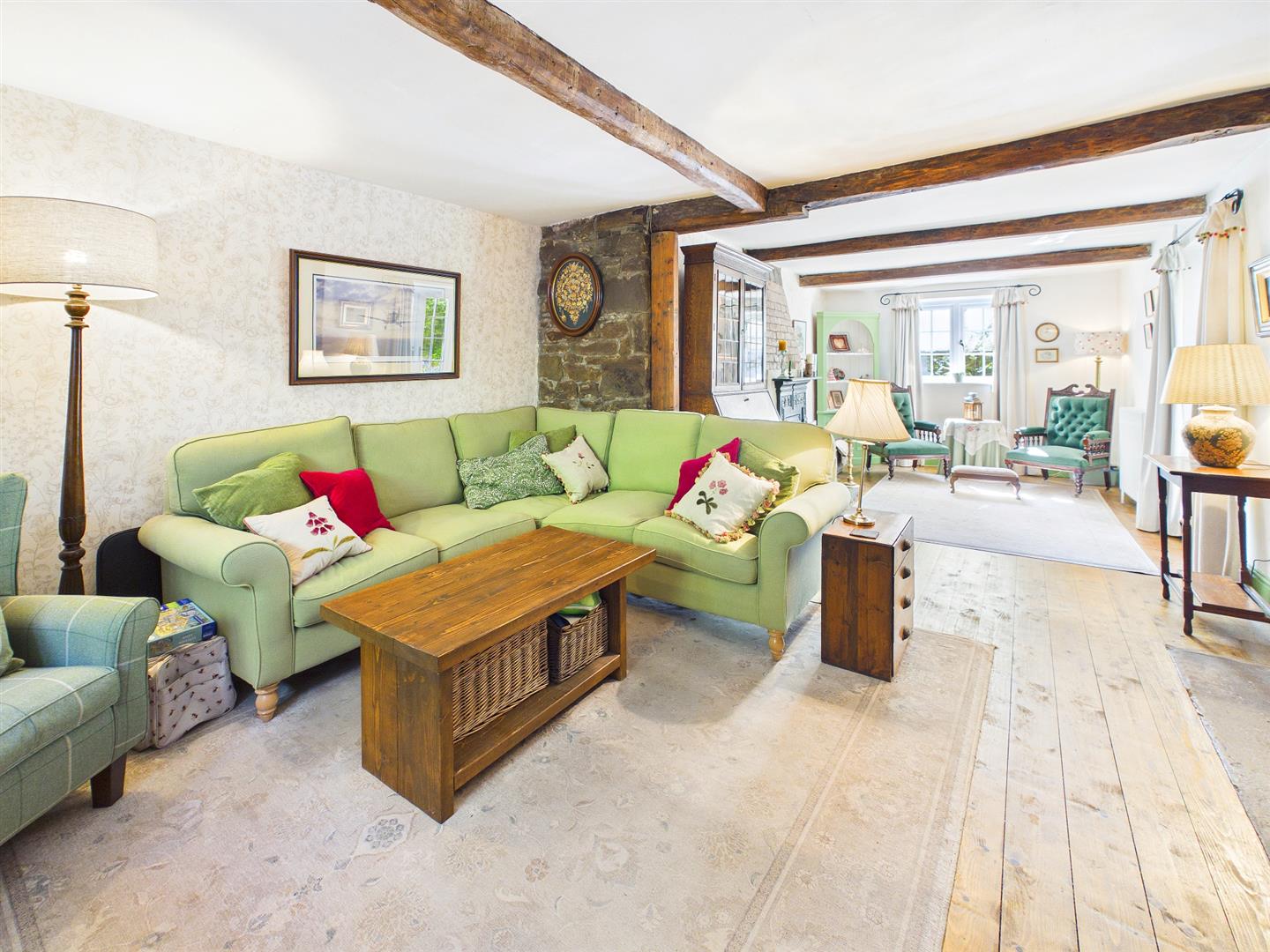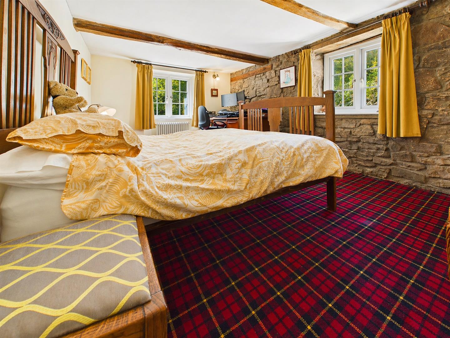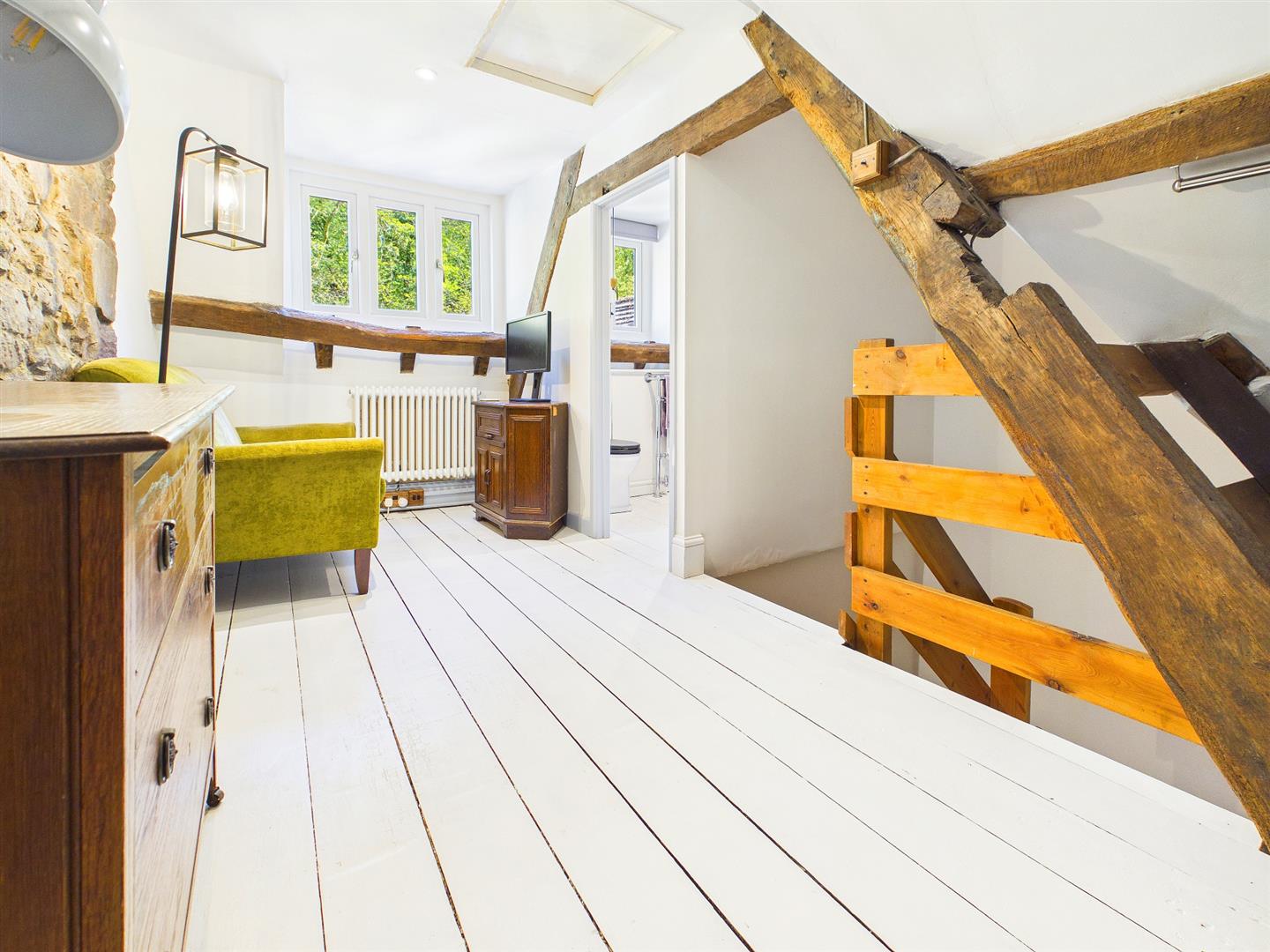 A well-proportioned double room enjoying a dual aspect to front and side elevations as well as feature exposed beams and exposed stonewall.