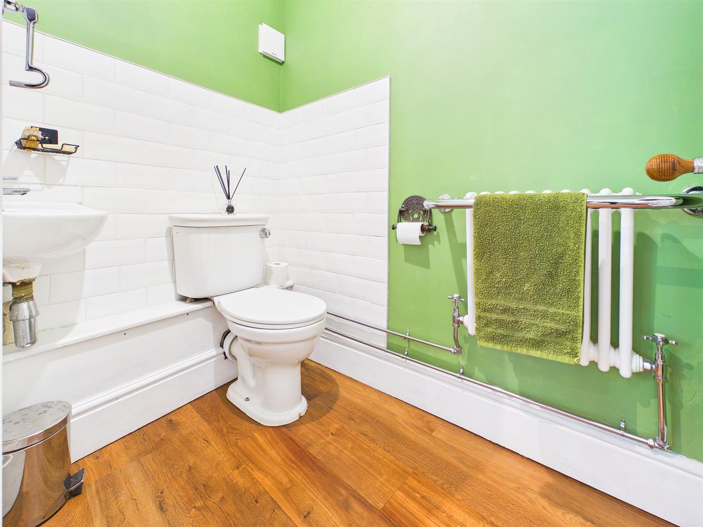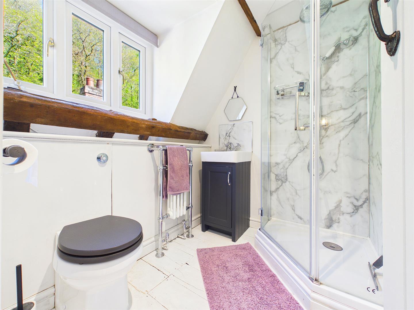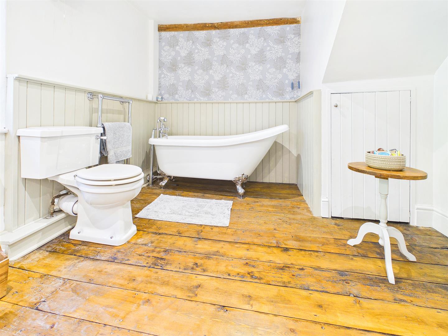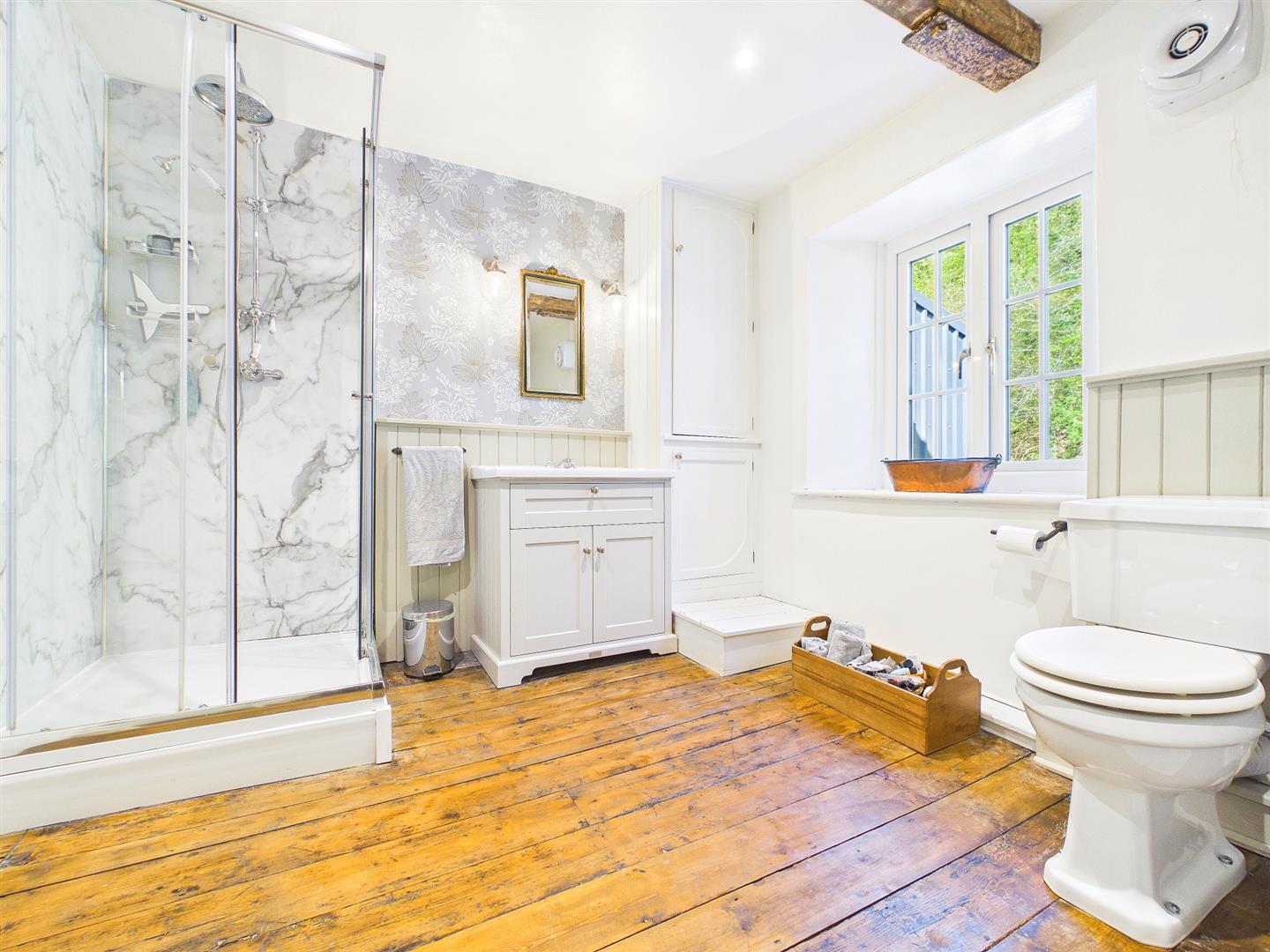A contemporary and character four piece suite to include free standing roll top bath with handheld shower attachment, walk-in corner shower cubicle with mains fed waterfall overhead shower and separate handheld shower attachment, low-level WC and wash basin inset to vanity unit. Exposed wooden floorboards. Understairs storage cupboard. Heated towel rail. Feature exposed beams and half wood panelling to walls. Window to rear elevation overlooking the open woodland.