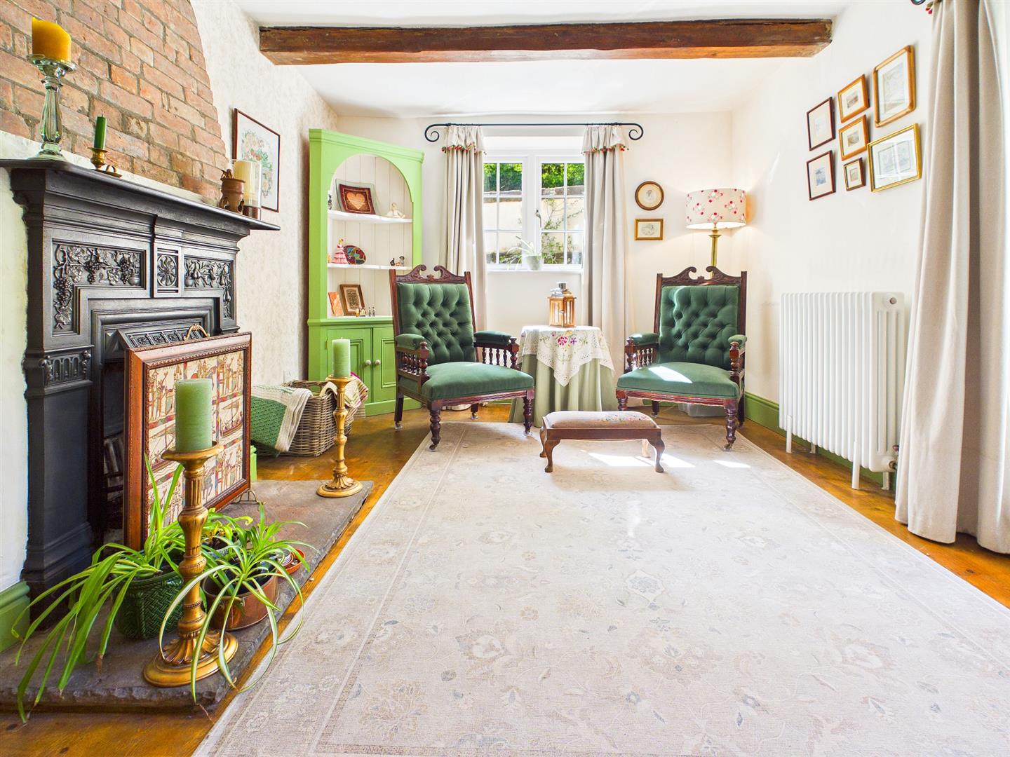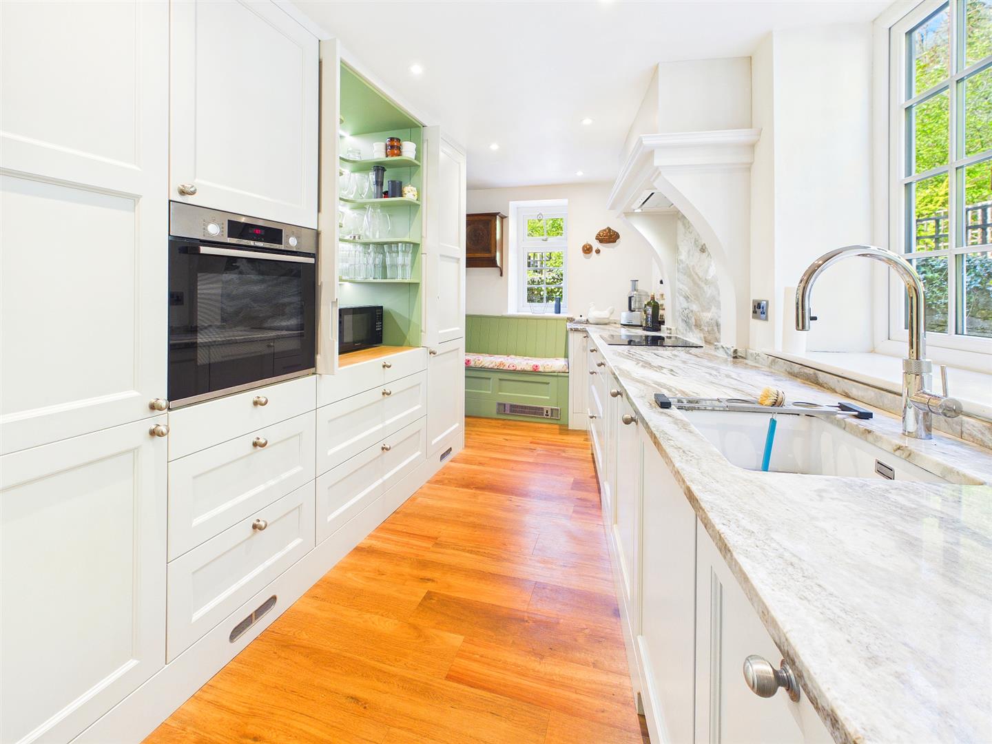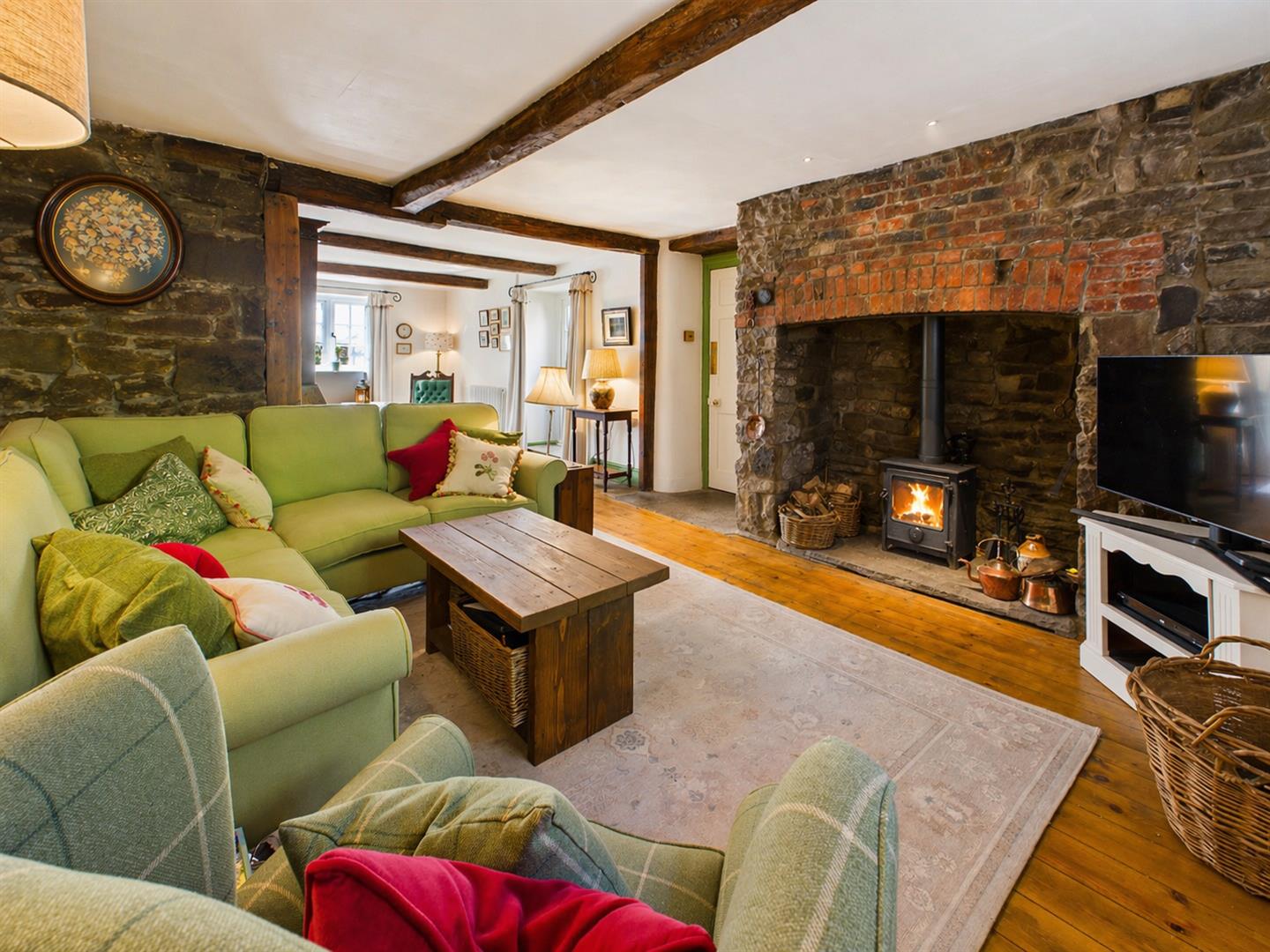 A very well proportioned open plan reception space with area for formal living as well as a second snug/sitting area with a lovely feature cast iron fireplace and brick chimney breast. Window to the front elevation and French doors to the side leading out to the private front courtyard. Solid wooden floorboards to the entire room. The living area provides a comfortable reception space with feature inset shelving and window to the rear elevation overlooking woodland. Fantastic open fireplace with free standing wood burner and brick and stone surround.