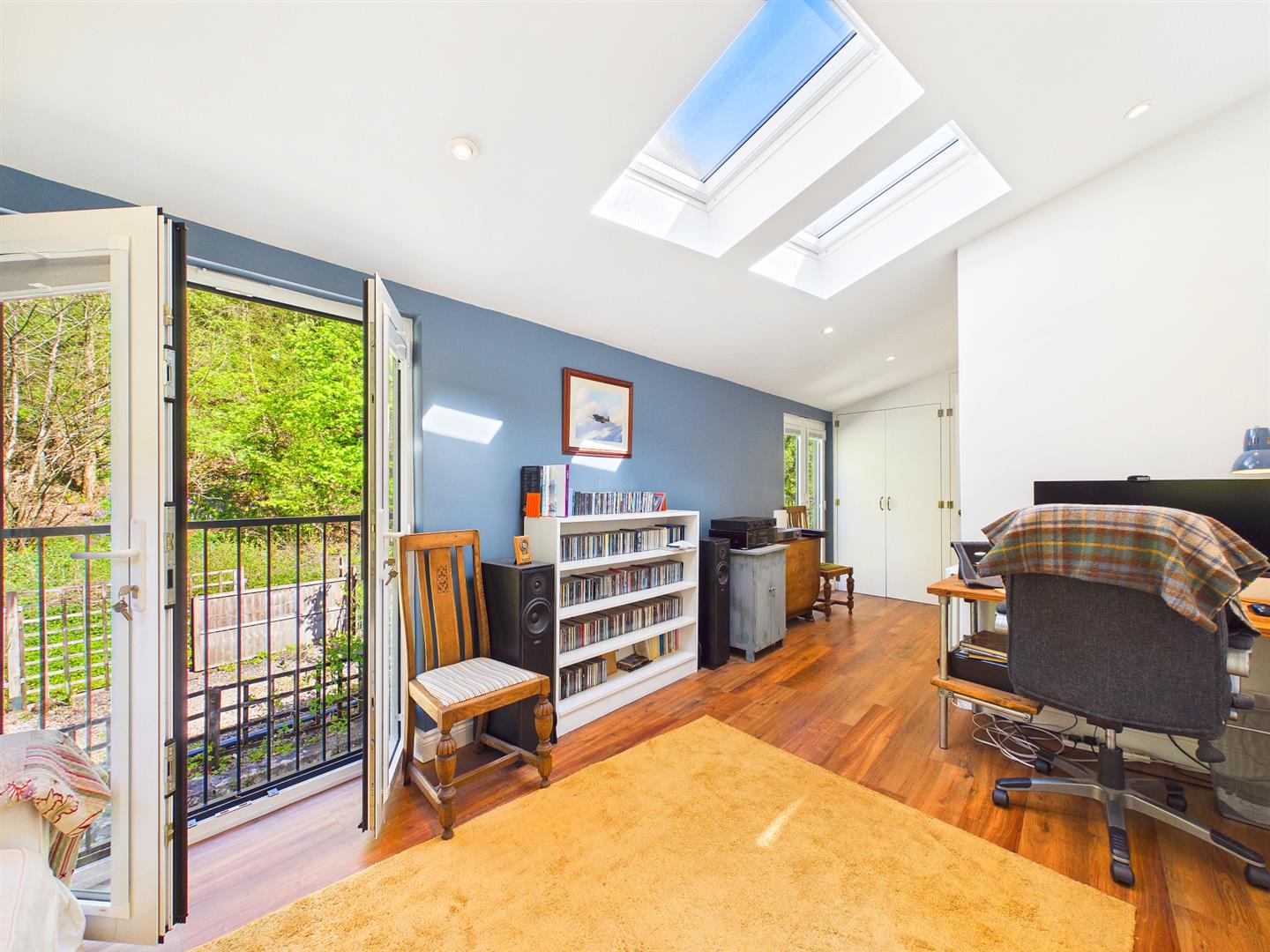This room offers fantastic versatile use either as a potential fourth double bedroom if required otherwise would provide a lovely light and airy hobby/reception space or indeed perfect study area for the everyday home worker. Wood effect luxury vinyl flooring. Two feature Velux windows flooding lots of natural light and window to the side elevation as well as two sets of French doors leading out to Juliet balconies at the rear enjoying uninterrupted views over the private gardens and open woodland beyond. Fitted wardrobes to one side.