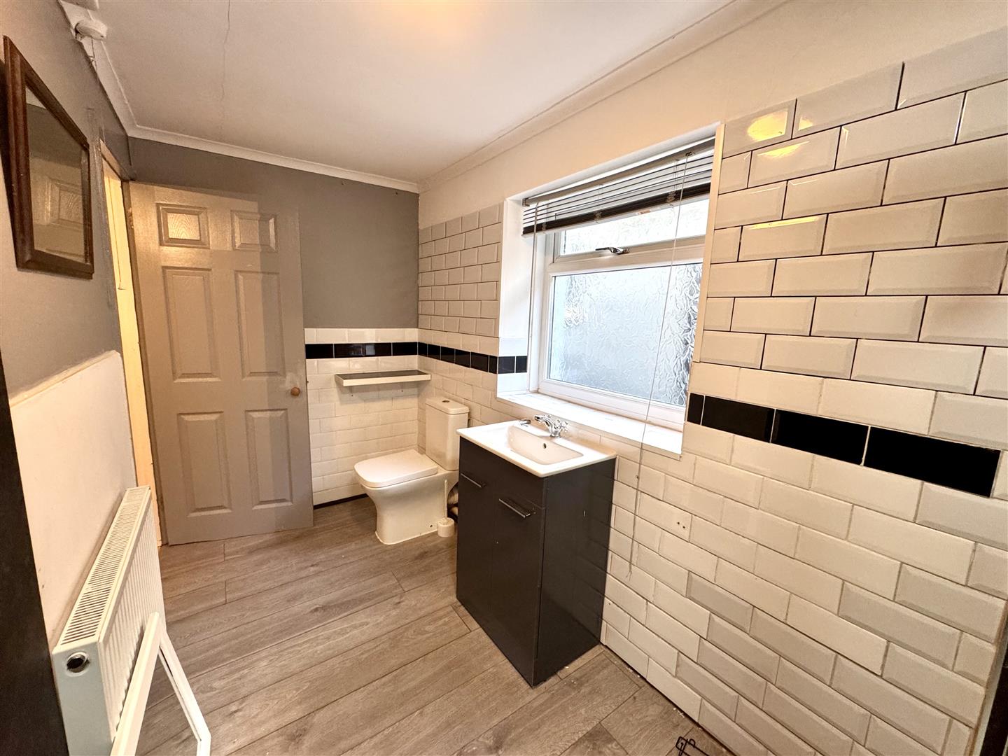 A really good size room offering fantastic potential to insert a bath and enjoy a four-piece suite if desired. Currently comprising a walk-in shower cubicle with wall-mounted mains fed shower unit and PVC surround, wash hand basin inset to vanity unit and low-level WC. Wood effect laminate floor and half-tiled walls. Frosted window to the side elevation.