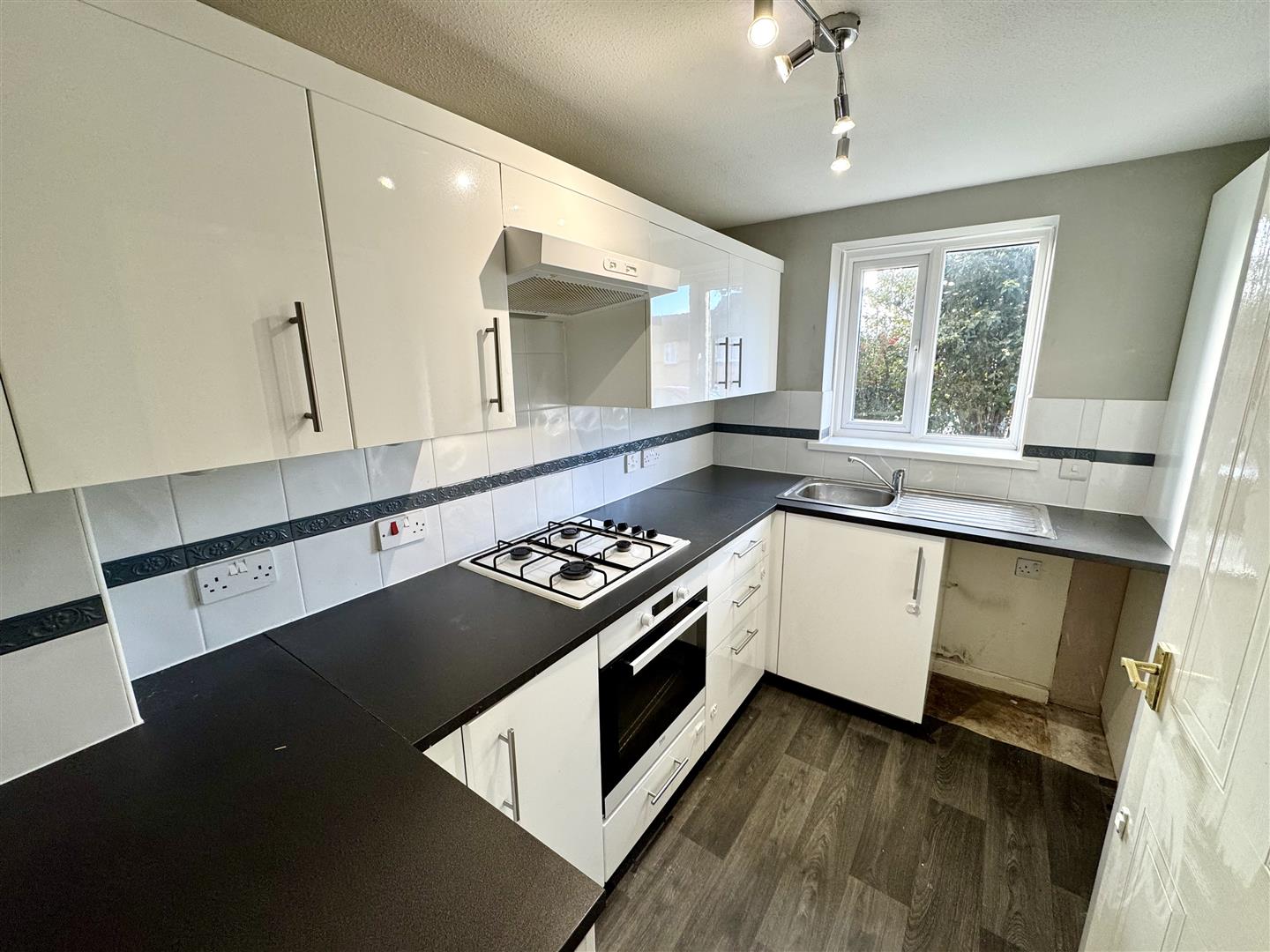 A modern kitchen appointed with a range of fitted wall and base units with ample laminate worktop and tile splashbacks. Inset single bowl stainless steel sink with drainer and mixer tap. Integrated four ring gas hob with extractor hood over and electric oven/grill beneath. Space for a free standing fridge/freezer along with space and plumbing for washing machine. Laminate wood effect flooring and window to the front elevation.