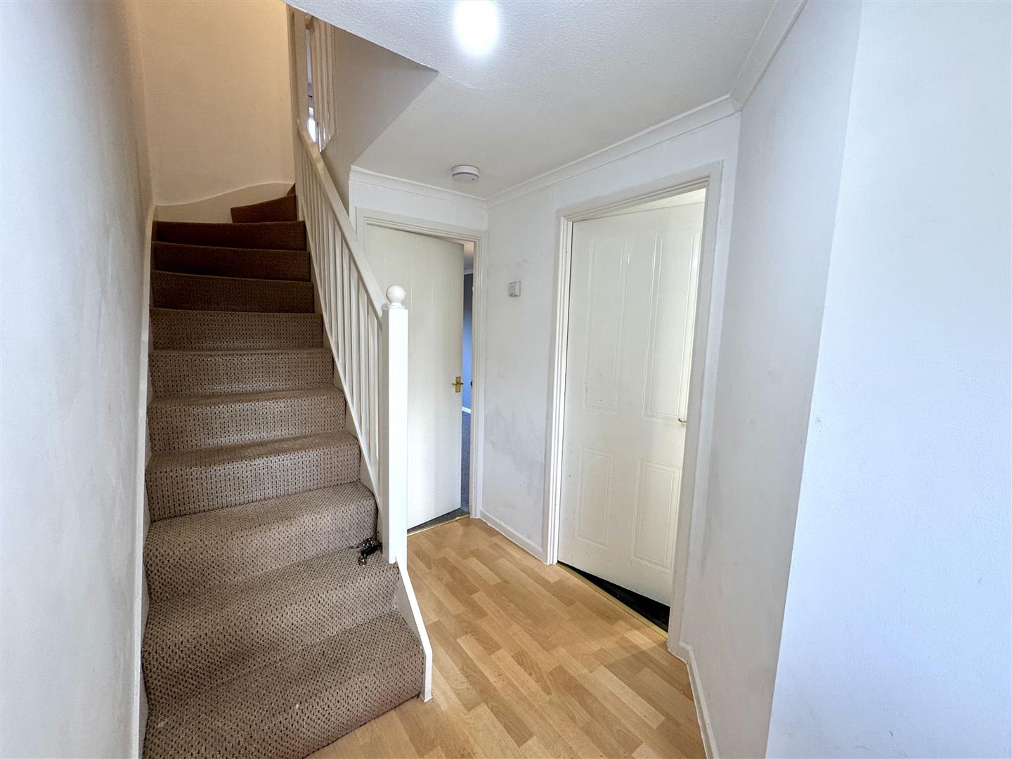 A welcoming and spacious hall with wood effect laminate floor, and staircase leading to the first floor landing.