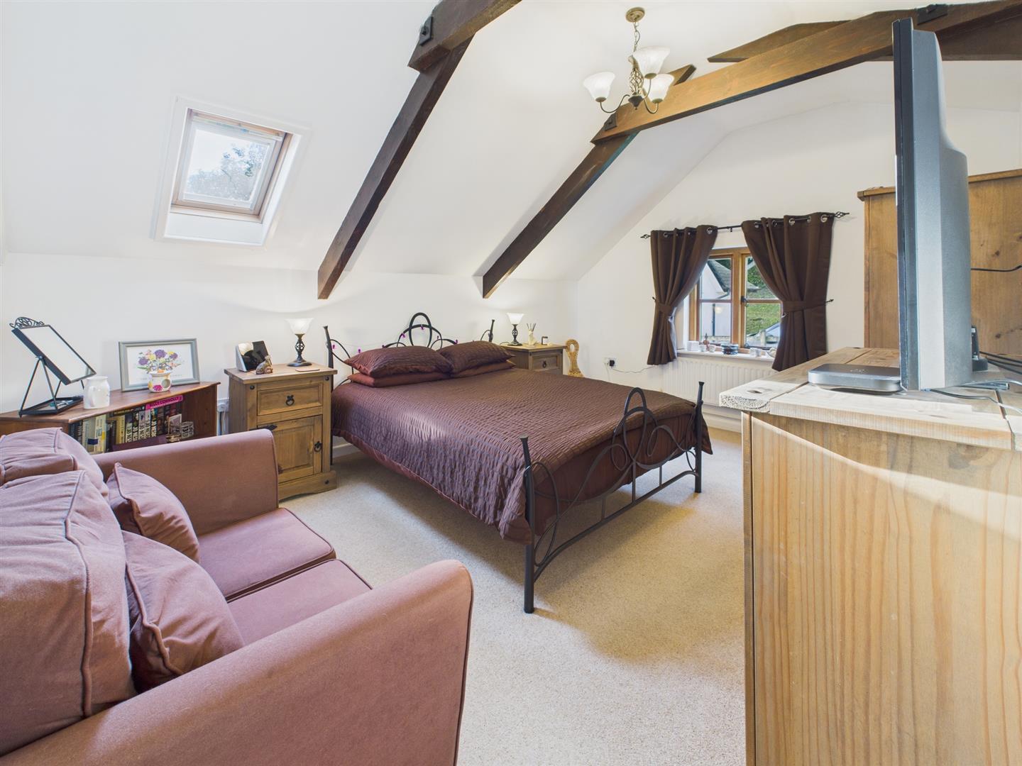 A spacious bedroom with high-level beamed ceiling. Window to the side elevation overlooking the gardens and velux style roof light.