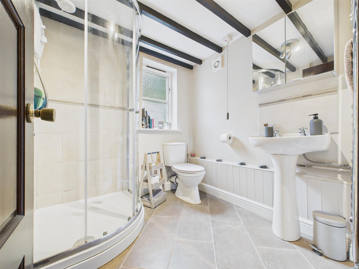 Comprising a three-piece suite to include a low-level WC, pedestal wash basin with tiled splashback and corner step-in shower. Tiled flooring and beamed ceiling. Window to side elevation.