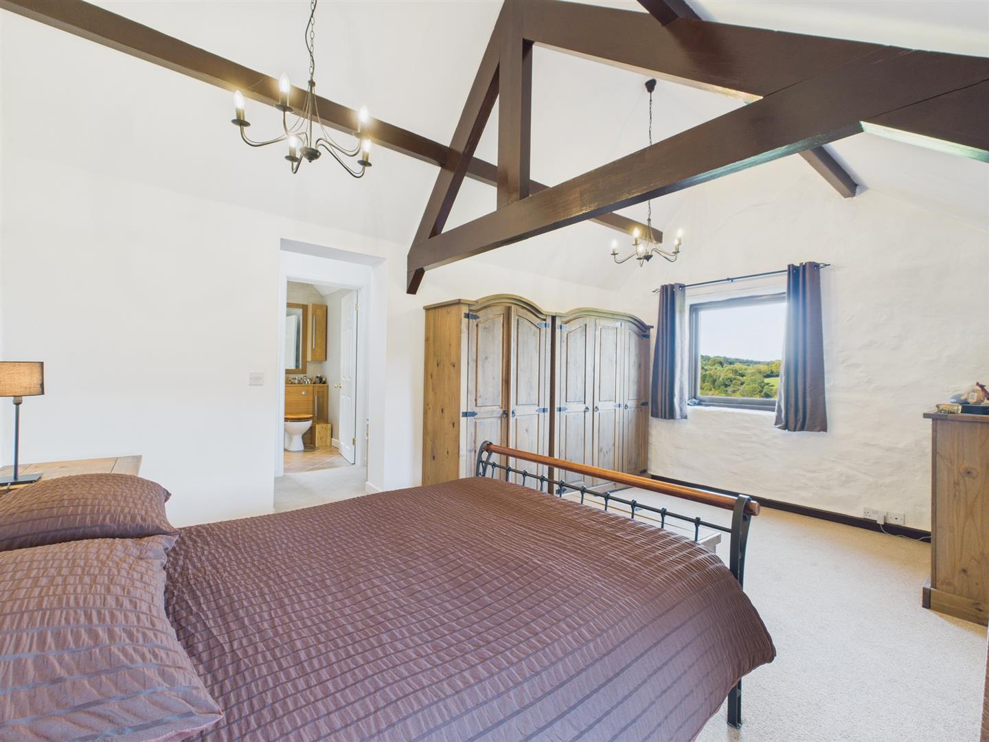 An attractive and spacious principal bedroom with high-level beamed ceiling, dual aspect windows to the front and rear elevations with commanding rural views.