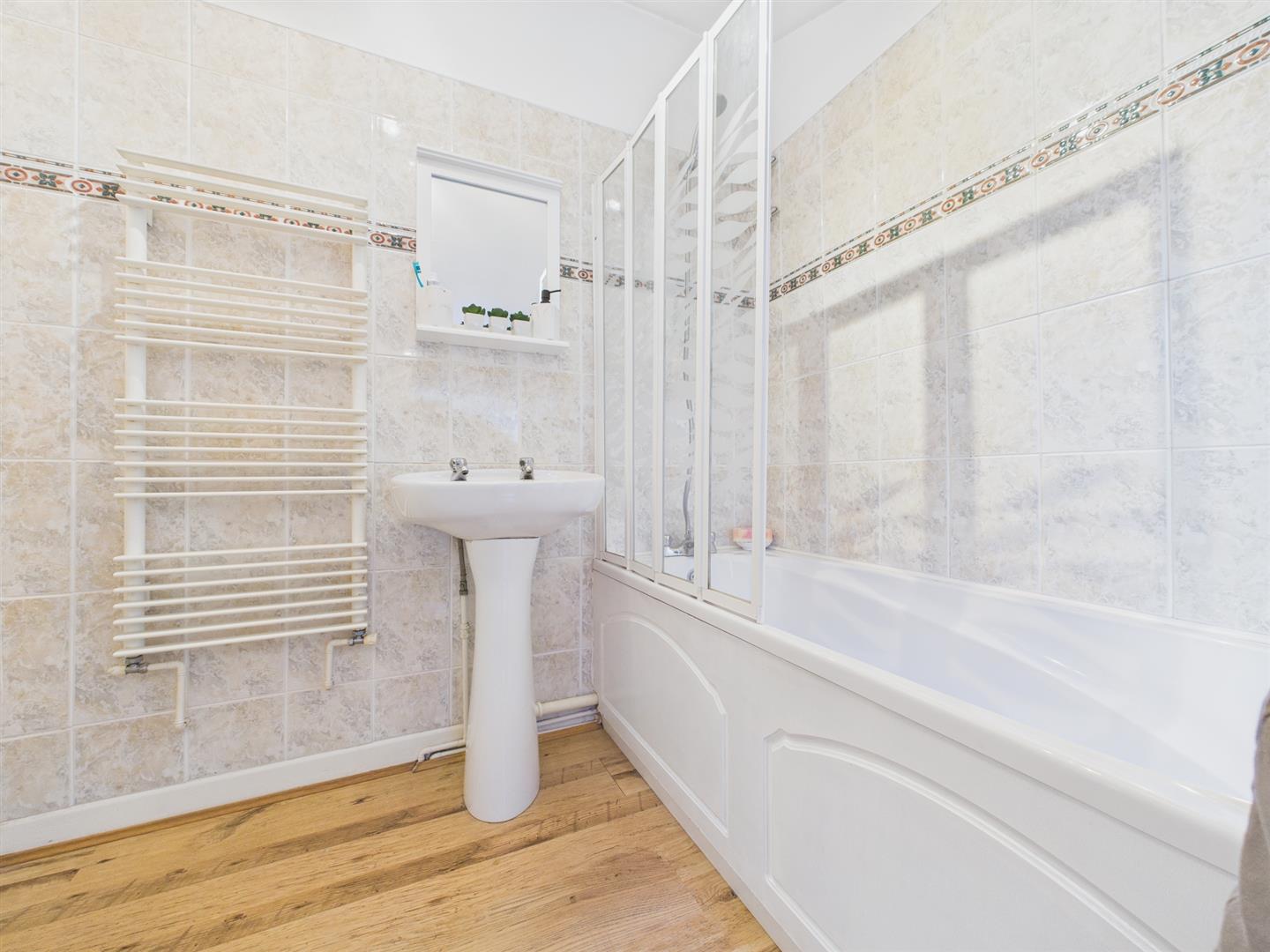 With a three-piece suite comprising panelled bath with shower attachment over and glass shower screen, low-level WC, and wash hand basin. Fully tiled walls and wood effect flooring. Heated towel rail. Window to the rear elevation.