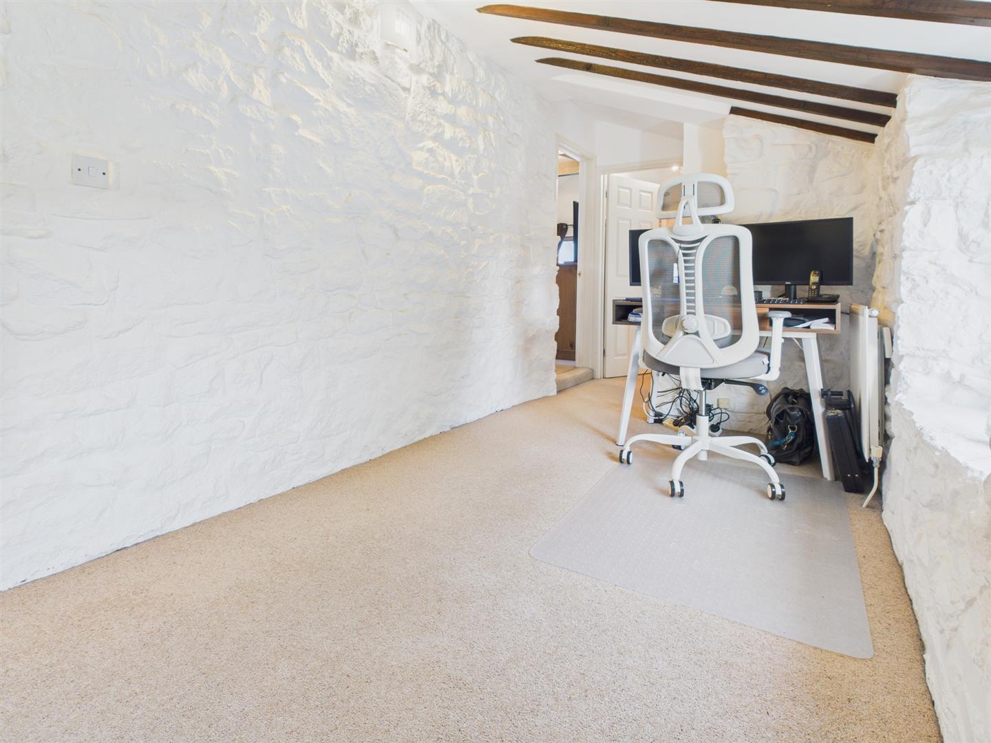 Part of the original cottage, this spacious reception room has two windows and wooden door to the front elevation. Feature original fireplace with wood-burning stove. Slate tiled flooring and beamed ceilings.