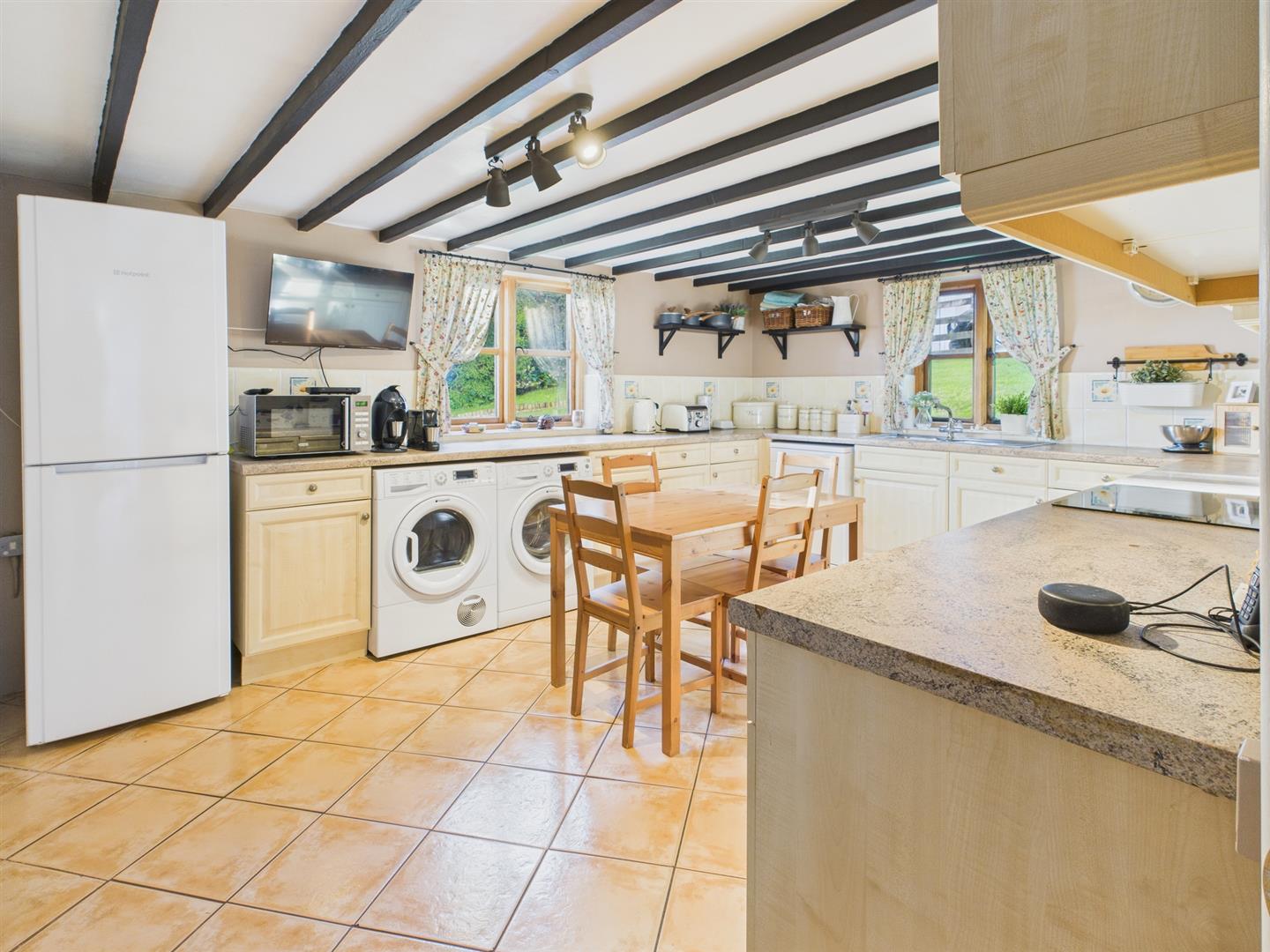 A well appointed farmhouse style kitchen with an excellent range of eye and base level storage units with ample work surfacing and tiled splashbacks. Inset one and a half bowl and drainer stainless steel sink unit. Integrated four ring electric hob with double electric oven beneath and extractor hood over. Space and plumbing for dishwasher, washing machine and tumble dryer. Beamed ceiling and tiled floor. Windows to front and side elevations.