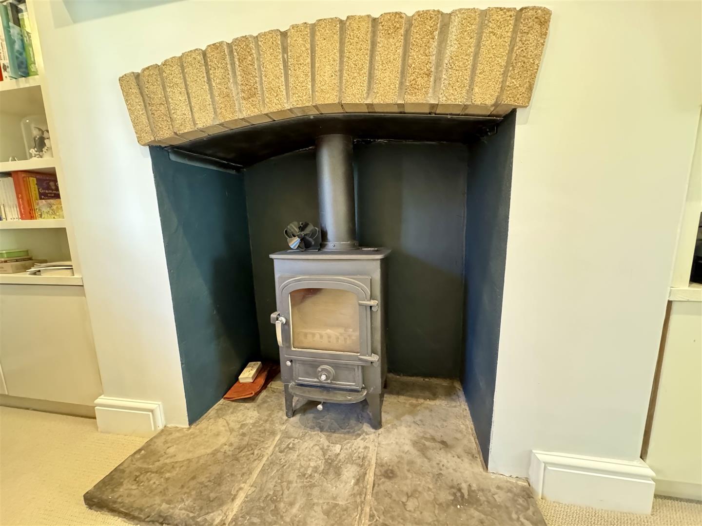 A bright and airy reception room with window to front elevation. Range of built-in shelving units and fireplace with wood burning stove. Open to: -