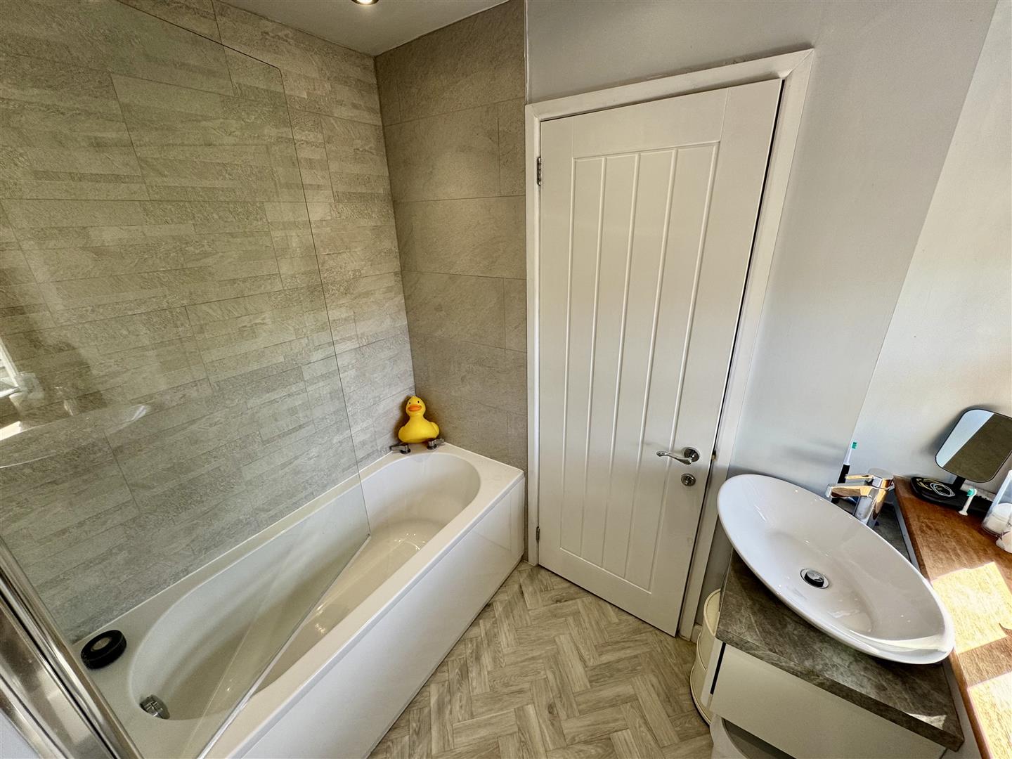 Comprising a three-piece suite to include low-level WC, wash hand basin set over storage unit and panelled bath with shower over and shower glass screen. Part-tiled walls. Window to rear elevation.