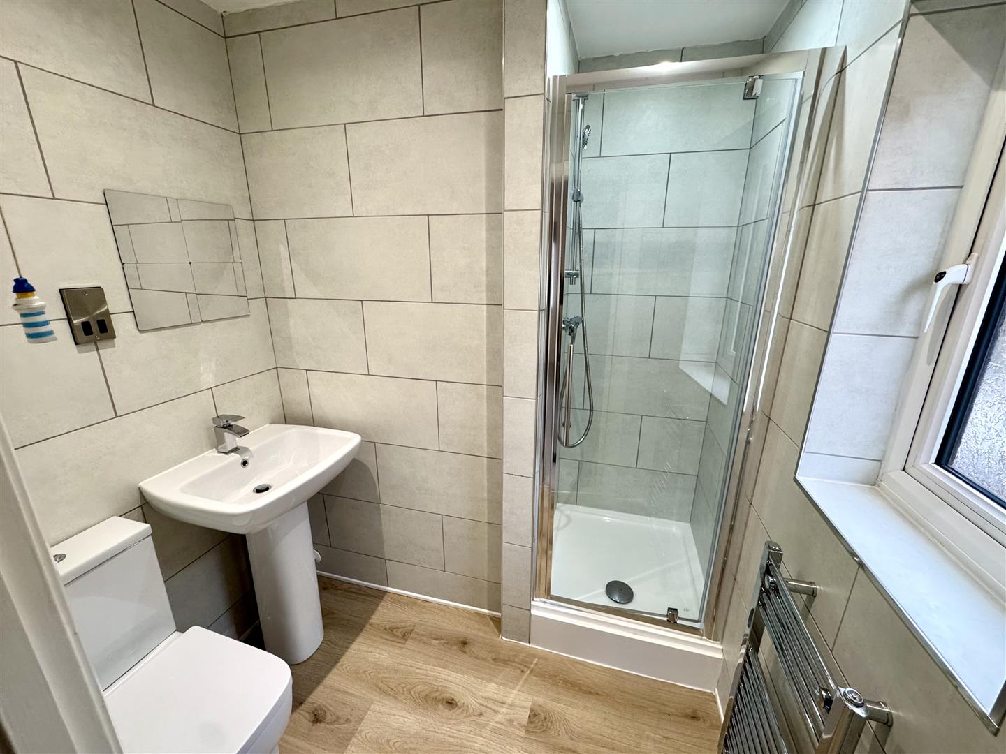 A neutral three-piece suite to include walk-in shower cubicle with tile surround and mains fed shower over, pedestal wash hand basin with mixer tap and low-level WC. Frosted window to the side elevation. Fully tiled walls and wood effect laminate flooring.
