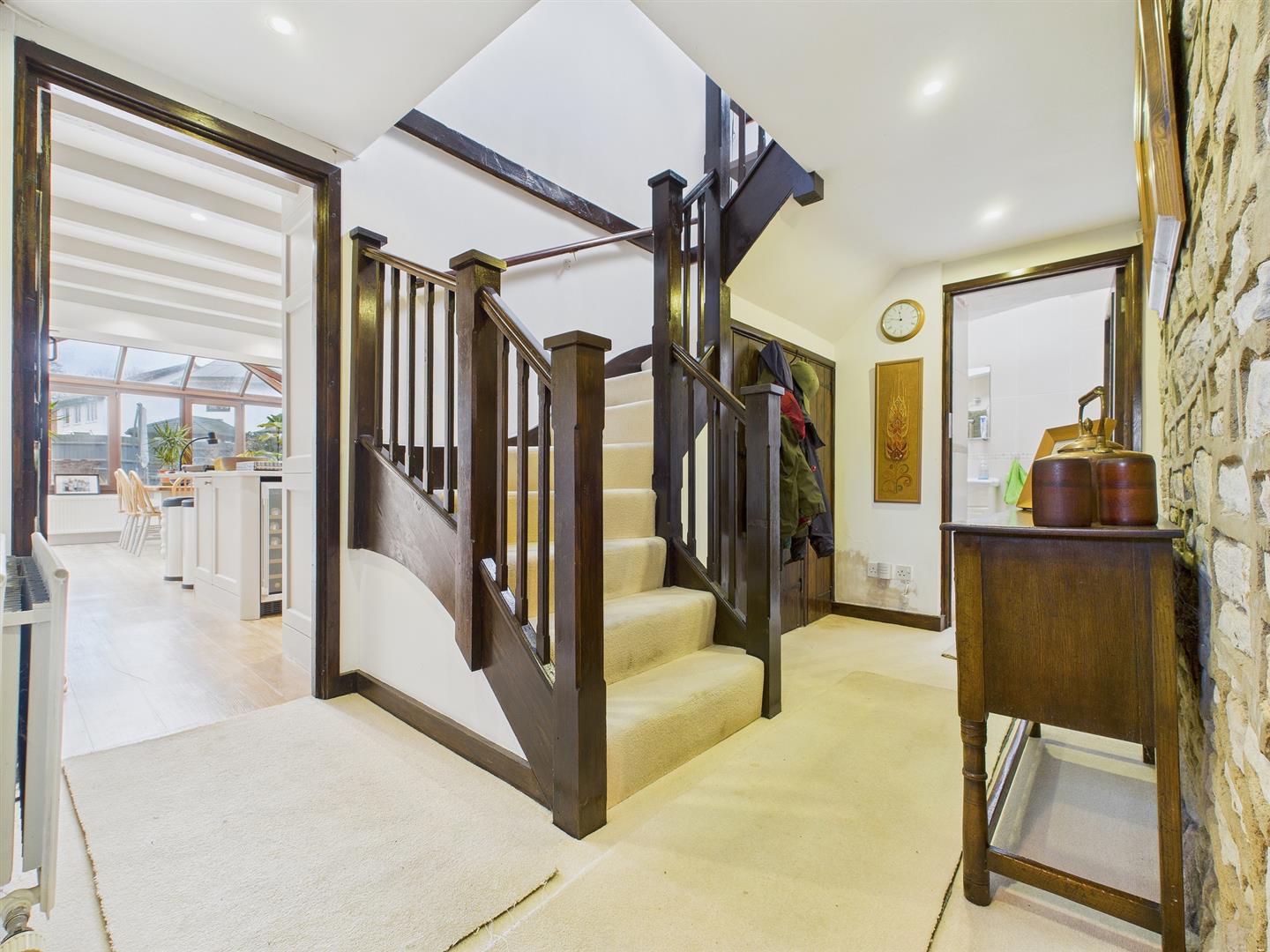 Spacious reception hall with door to side elevation. Attractive exposed stone wall. Stairs to first floor and two storage cupboards.