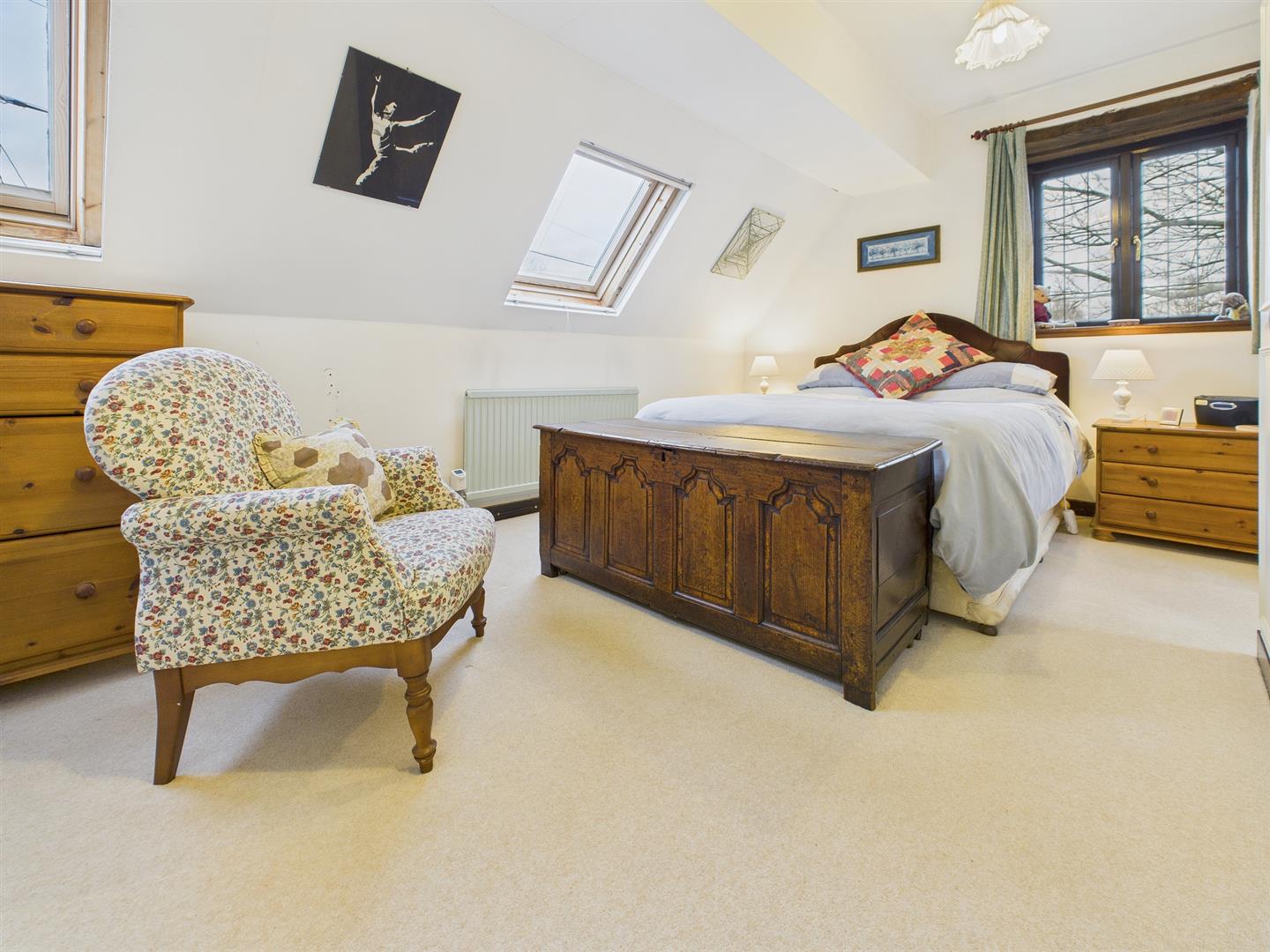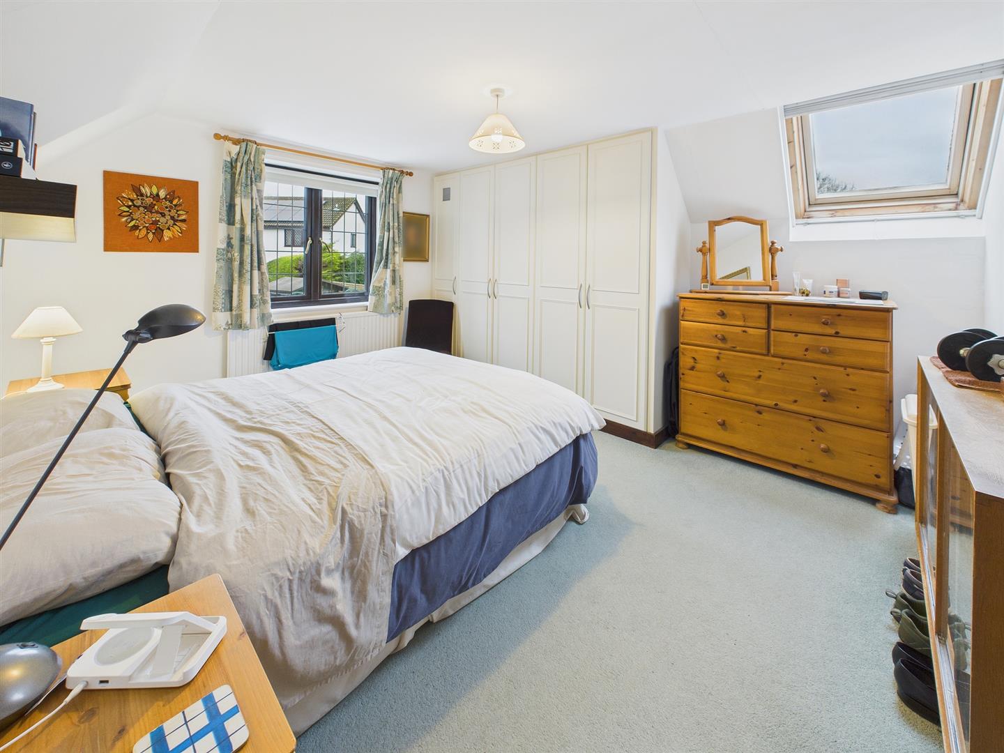 Spacious double bedroom with window to rear and Velux rooflight. Range of built-in wardrobes.