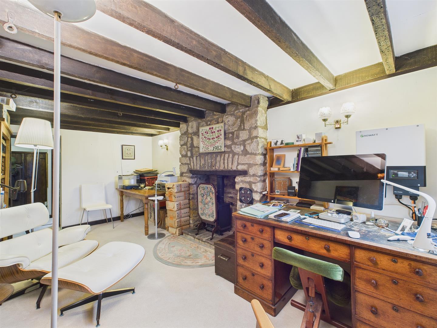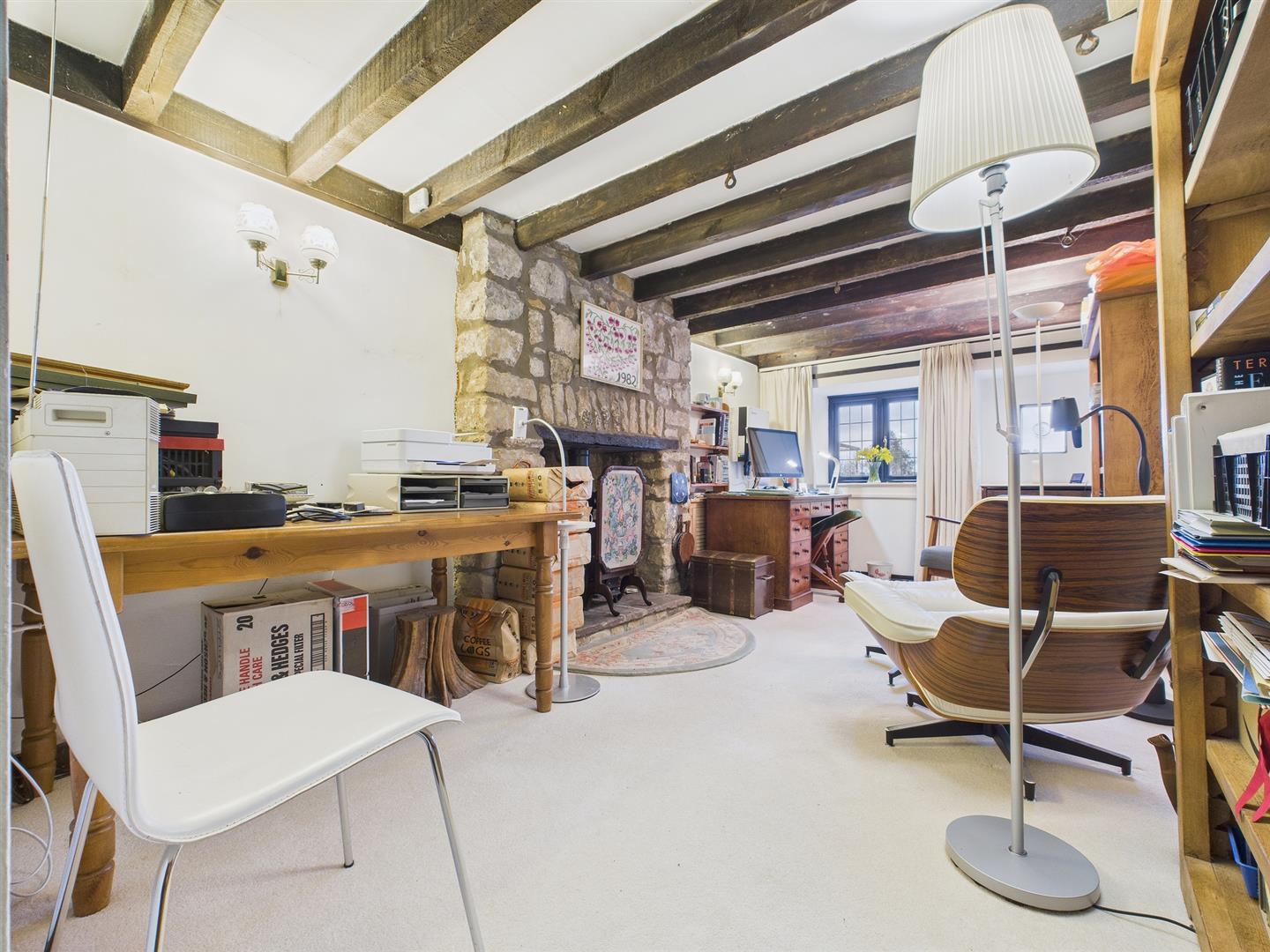 A charming principal reception room with windows to front and side elevations. Exposed stonework to two walls and exposed beams. Feature fireplace with wood burning stove.